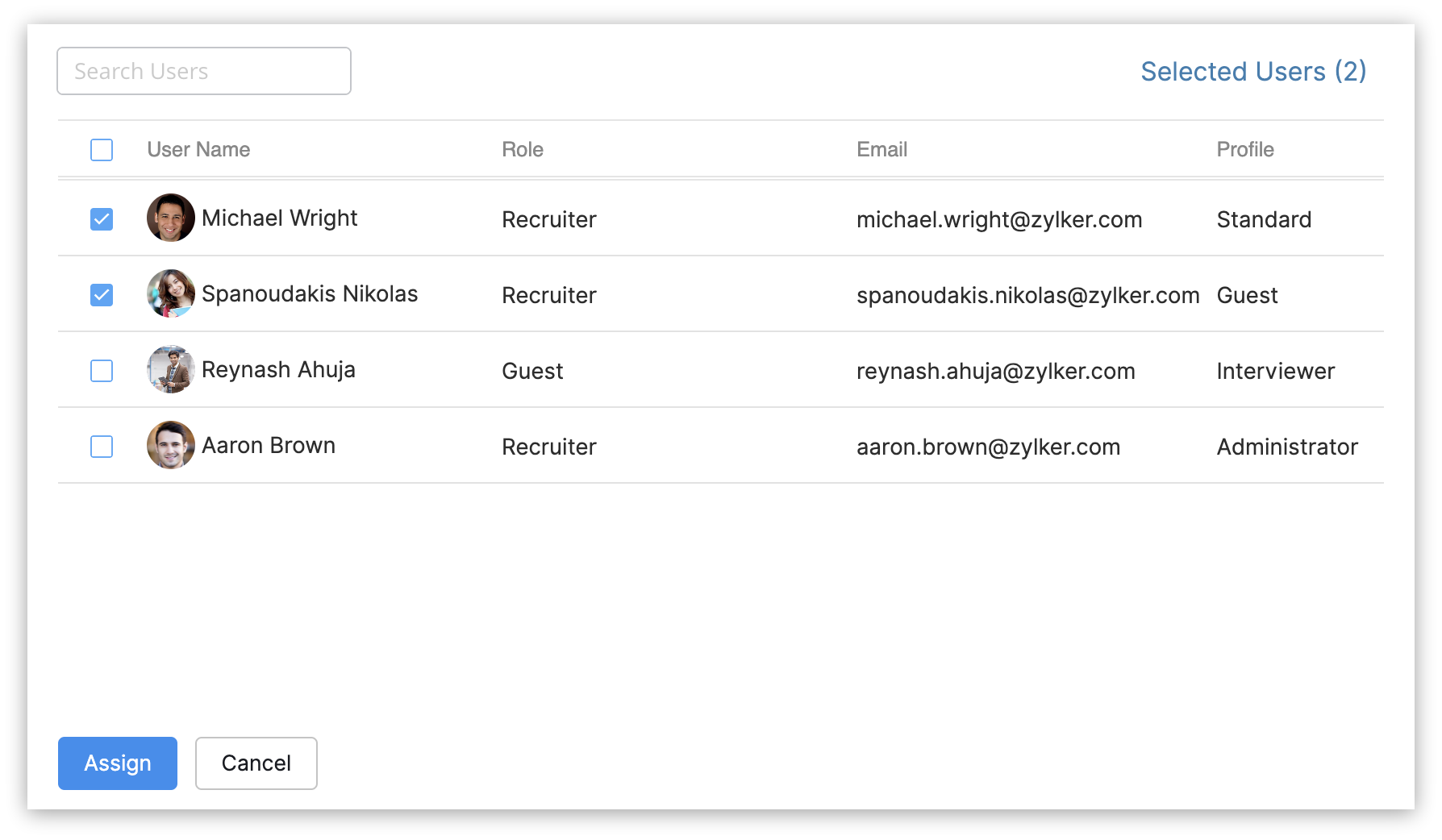 2. Click Add Users and select the Users you would like to add in Zoho Survey and click Assign.