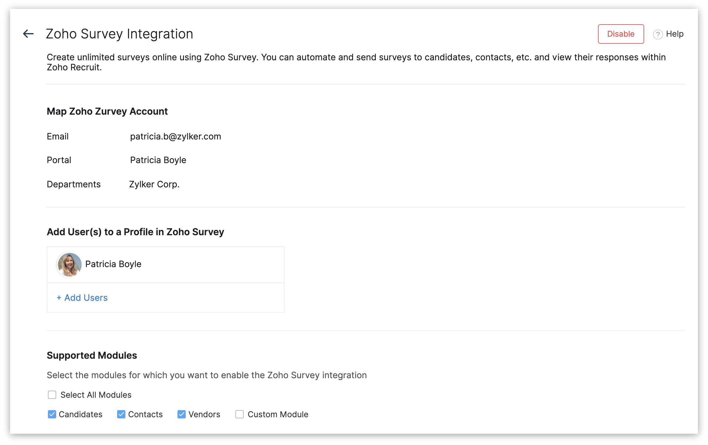 5. Once you enable Zoho Survey integration with Zoho Recruit, you can start sending surveys from the selected modules.