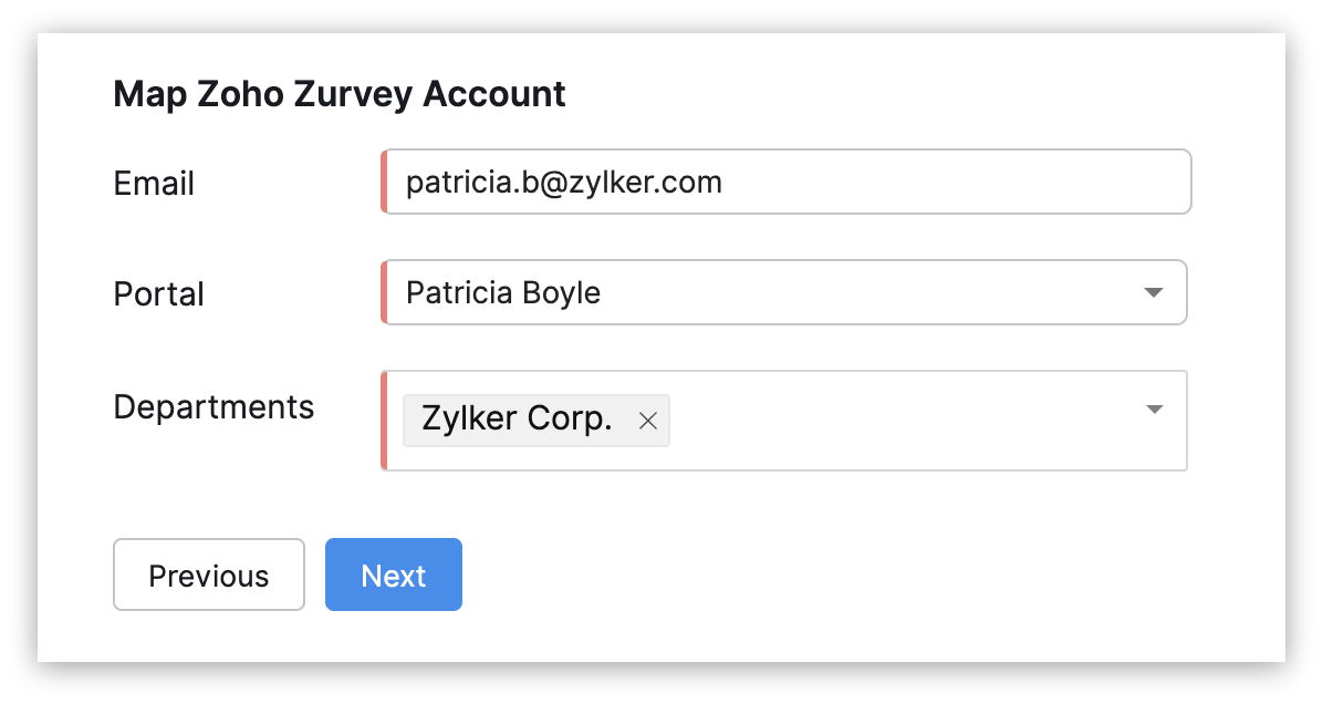 1. If you already have a Zoho Survey account, you can select the portal you want to map to. You can also choose a department within the portal. You can choose multiple departments as well.