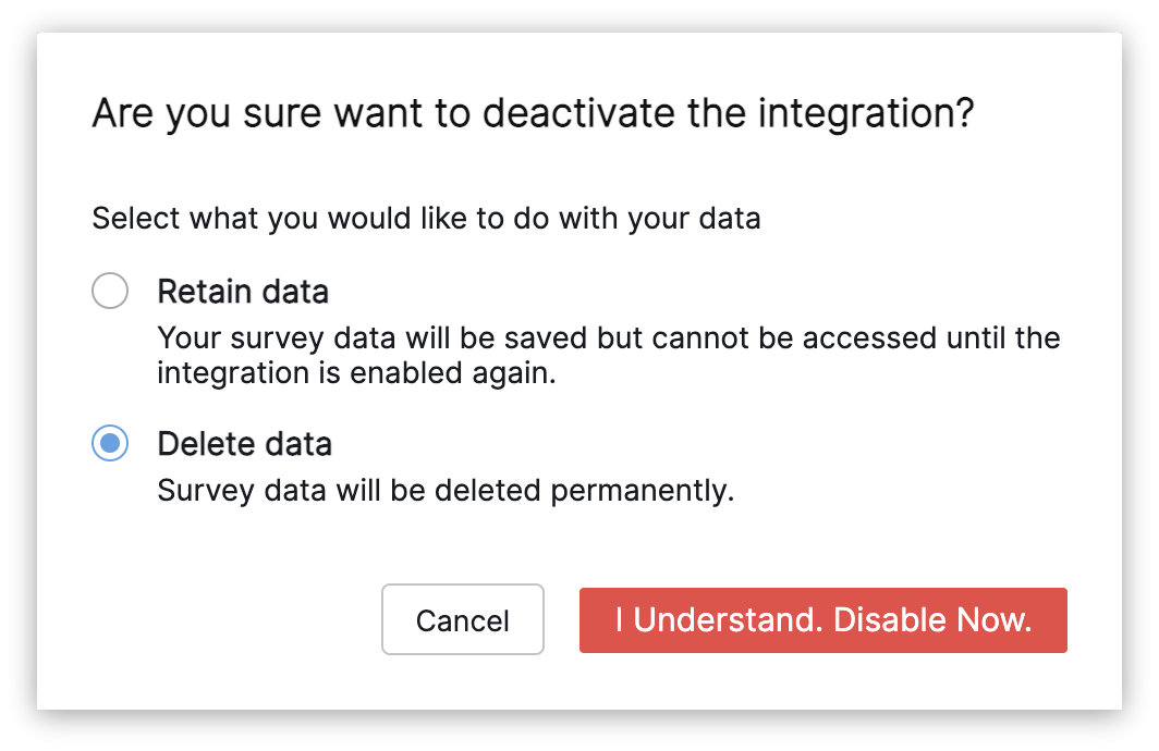 You can deactivate Zoho Survey Integration at any time. Deactivation of the integration does not interfere with your Zoho survey account settings. You can continue to build surveys from your Zoho Survey account. On deactivating: