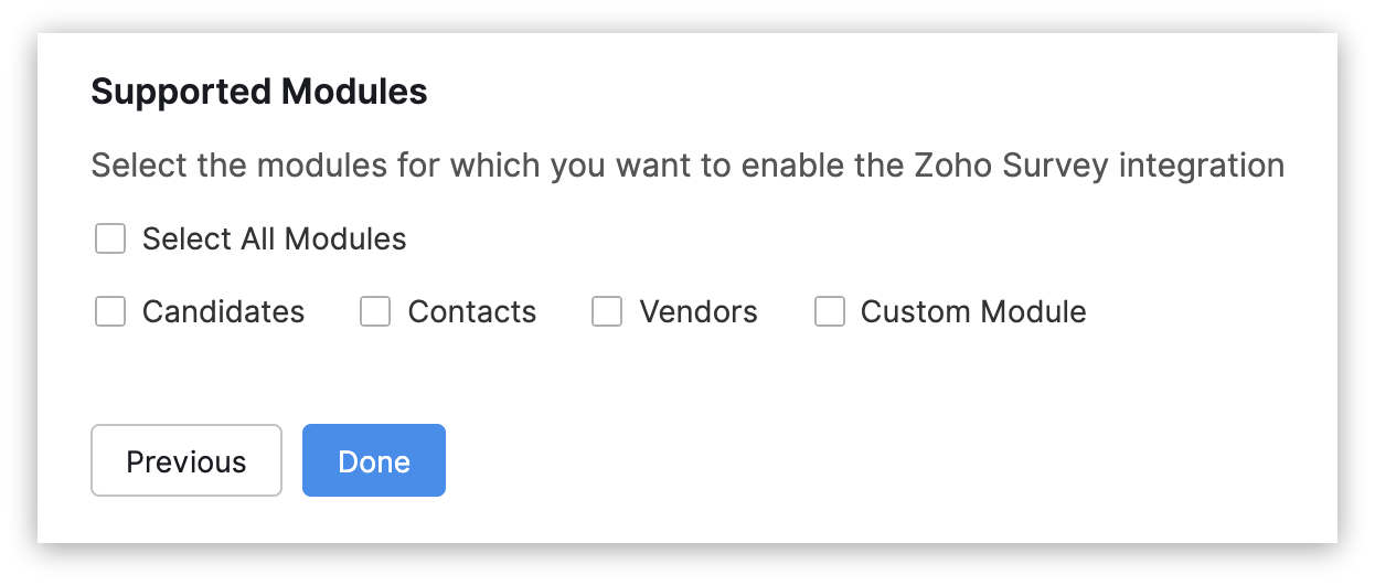 3. Select the modules from which you would like to send surveys. You can later unselect those modules from which you don't want to send surveys.