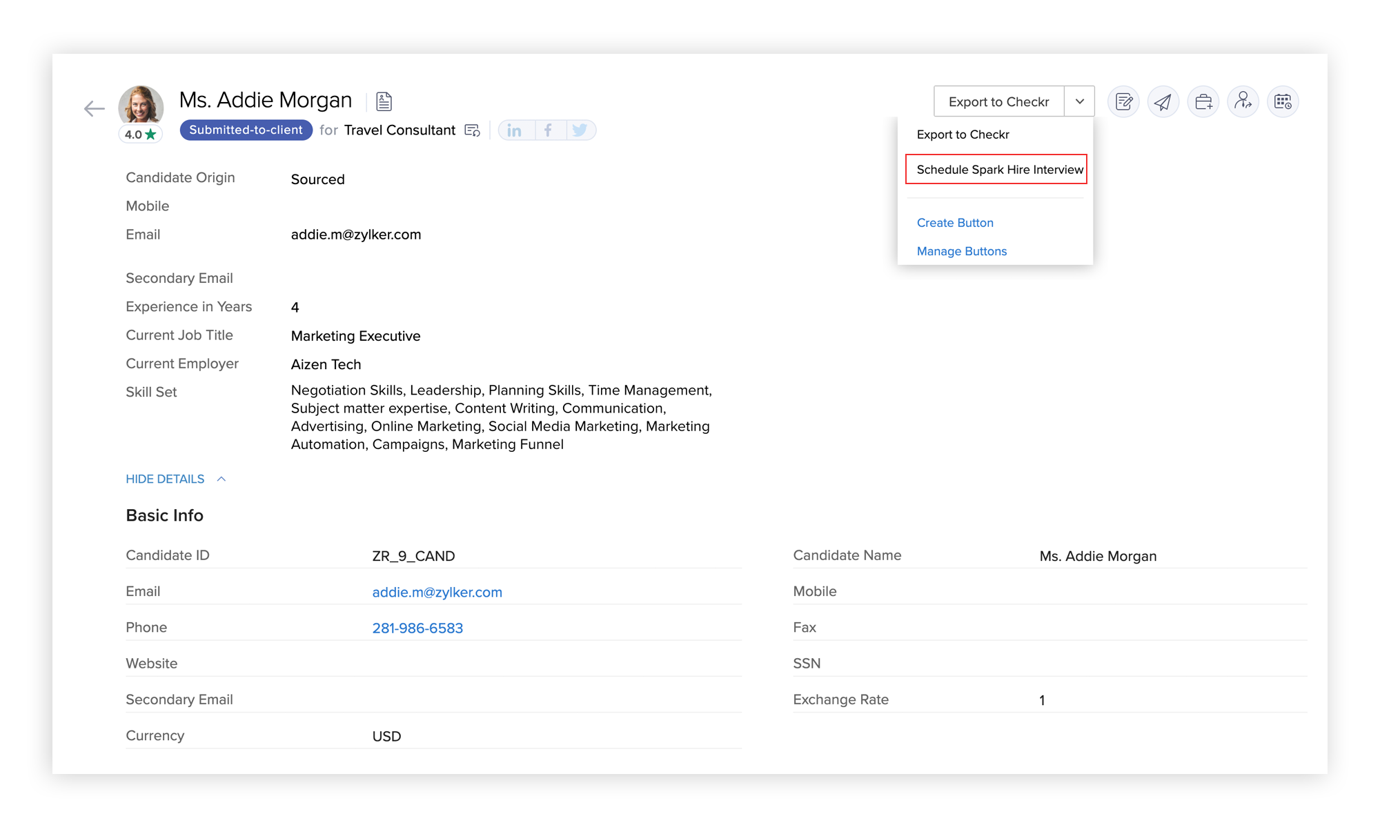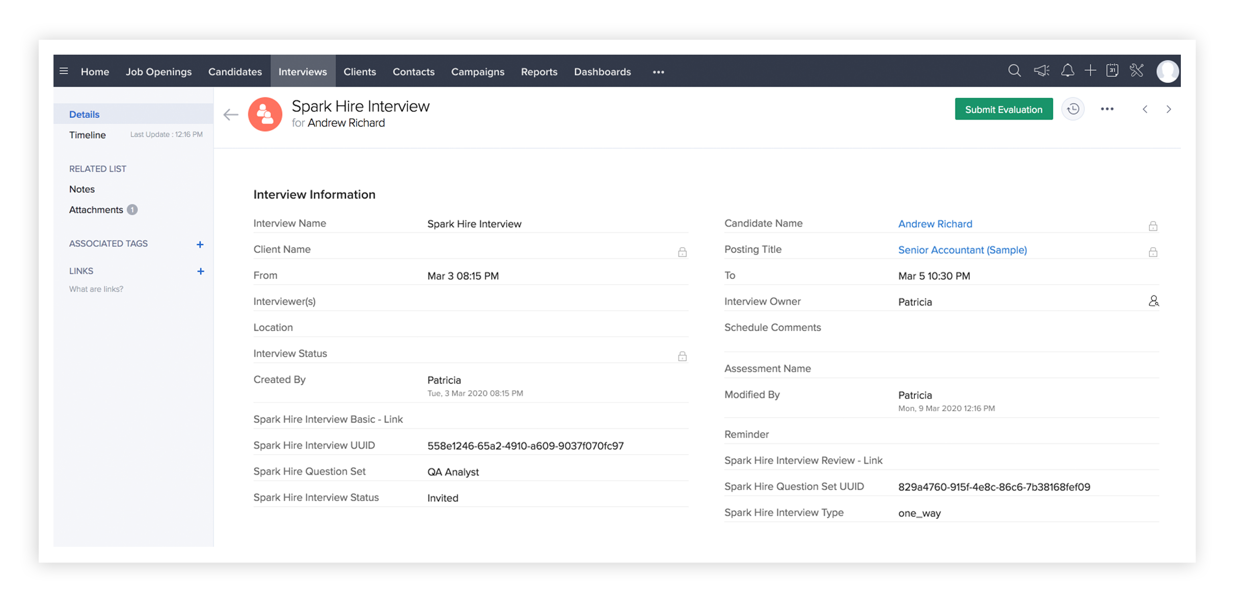 As a recruiter, you put in a lot of time and effort toward reaching quality candidates that fit your company's vision and workplace culture. And ever since the outbreak of COVID-19, many of you have adopted video interviewing as part of your virtual hiring environment. To help you have a stress-free hiring experience, Zoho Recruit integrates with Spark Hire to give you a tightly integrated and easy-to-use video interviewing experience while hiring candidates remotely.
