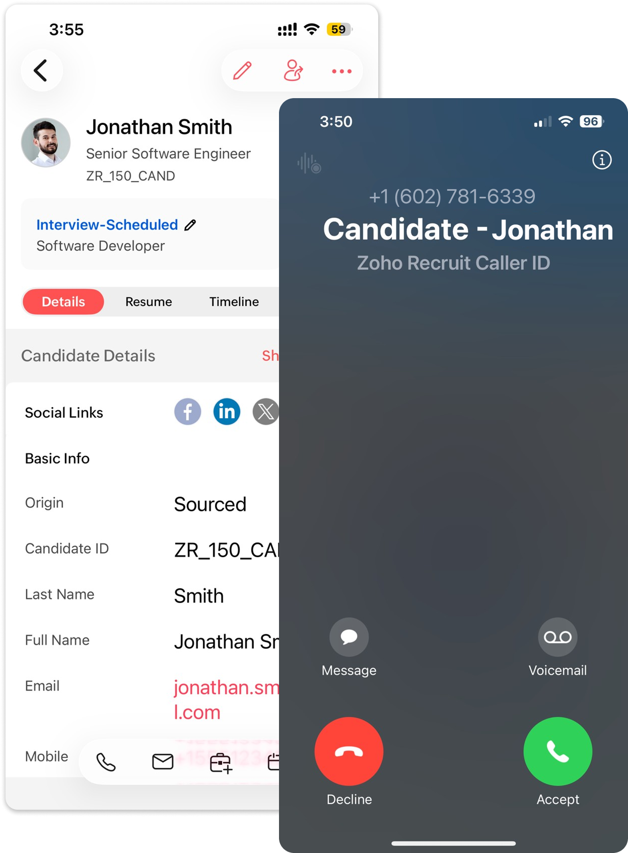 Know who’s calling before you pick up. Zoho Recruit instantly identifies candidates, clients, and contacts so you can respond faster and stay in control of every conversation.