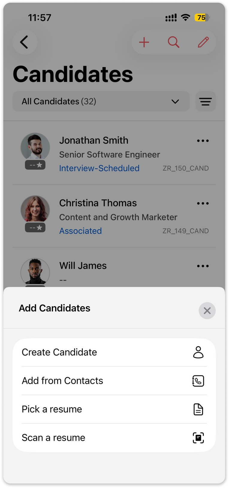 Add new candidates by scanning resumes/CVs directly from then mobile app.
