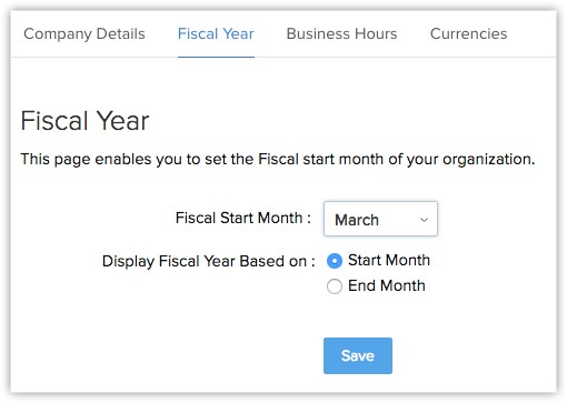 2. Let's say your fiscal year starts in April 2013 and ends in March 2014. If you choose to name the fiscal year based on the start month, the year name will be displayed as 2013 (in reports and other mentions) and if you choose to name the fiscal year based on the end month, the year name will be displayed as 2014.
