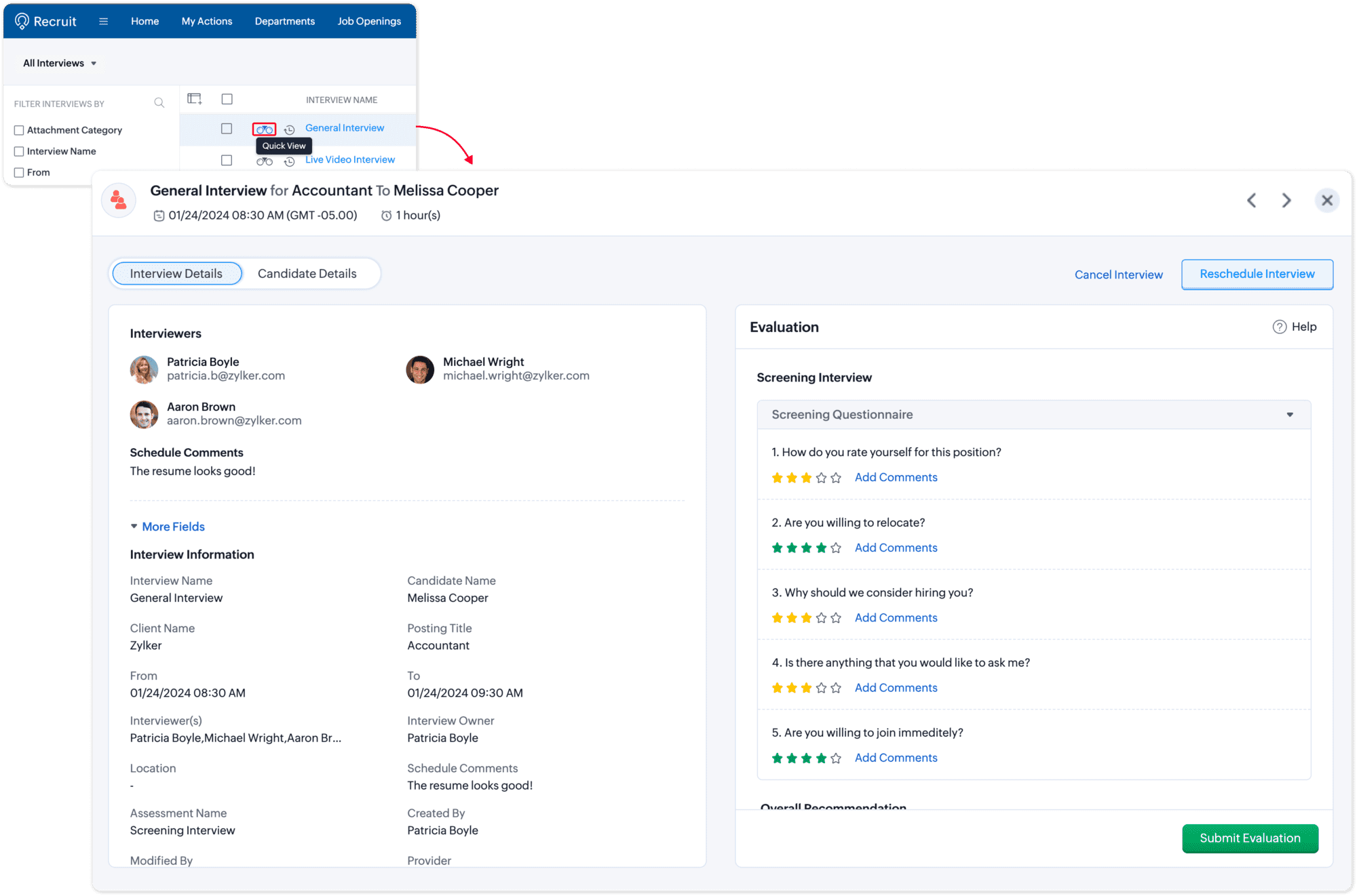 - Actionable Insights: Easily access key actions directly from the Quick View. Reschedule/Cancel the interview, submit your interview evaluation, or hire/reject & lock candidates– in just a few clicks.