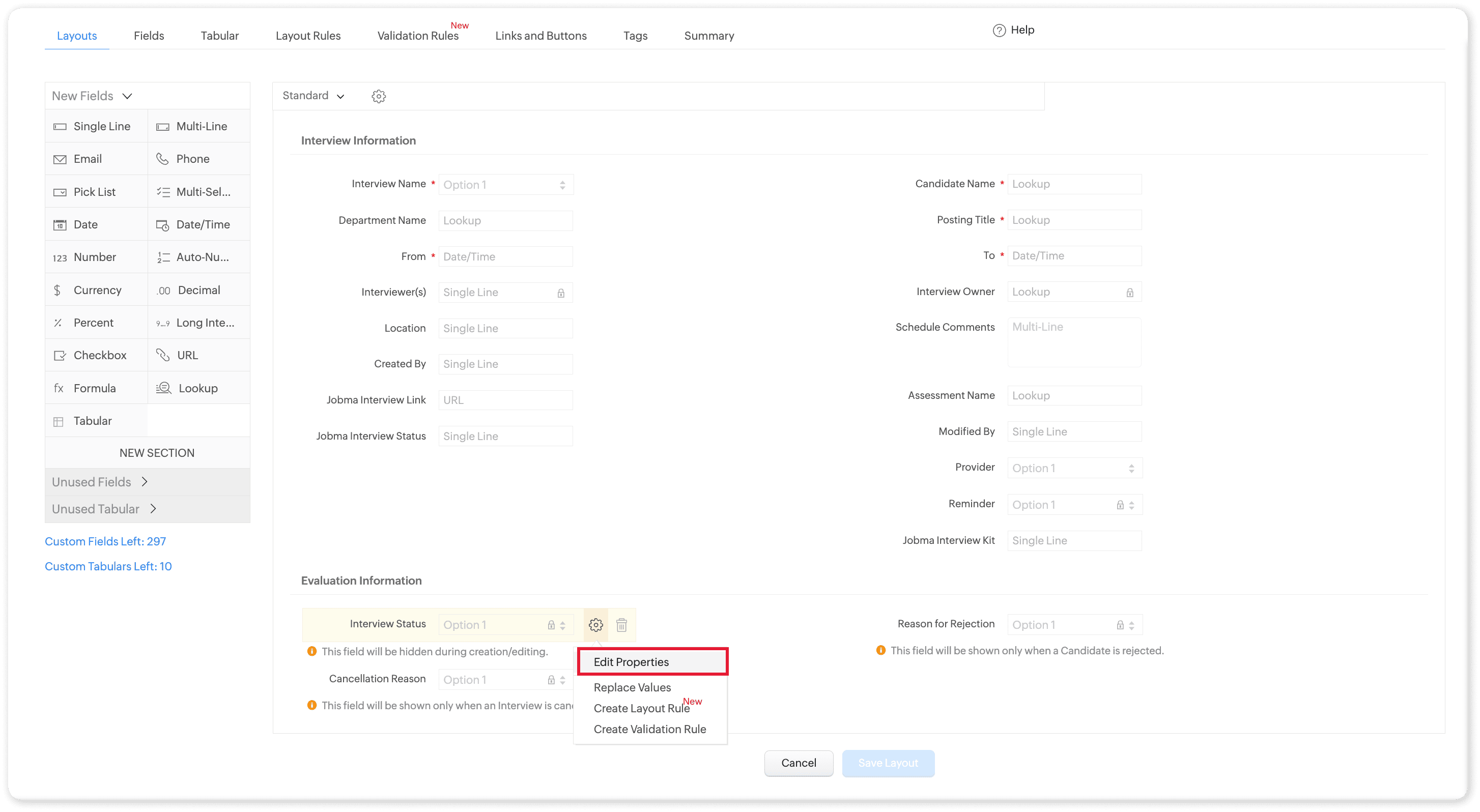 - Click Edit Properties next to the preferred field (in this case, 'Interview Status').