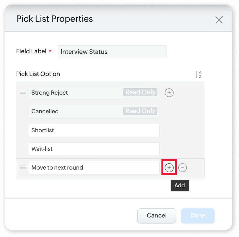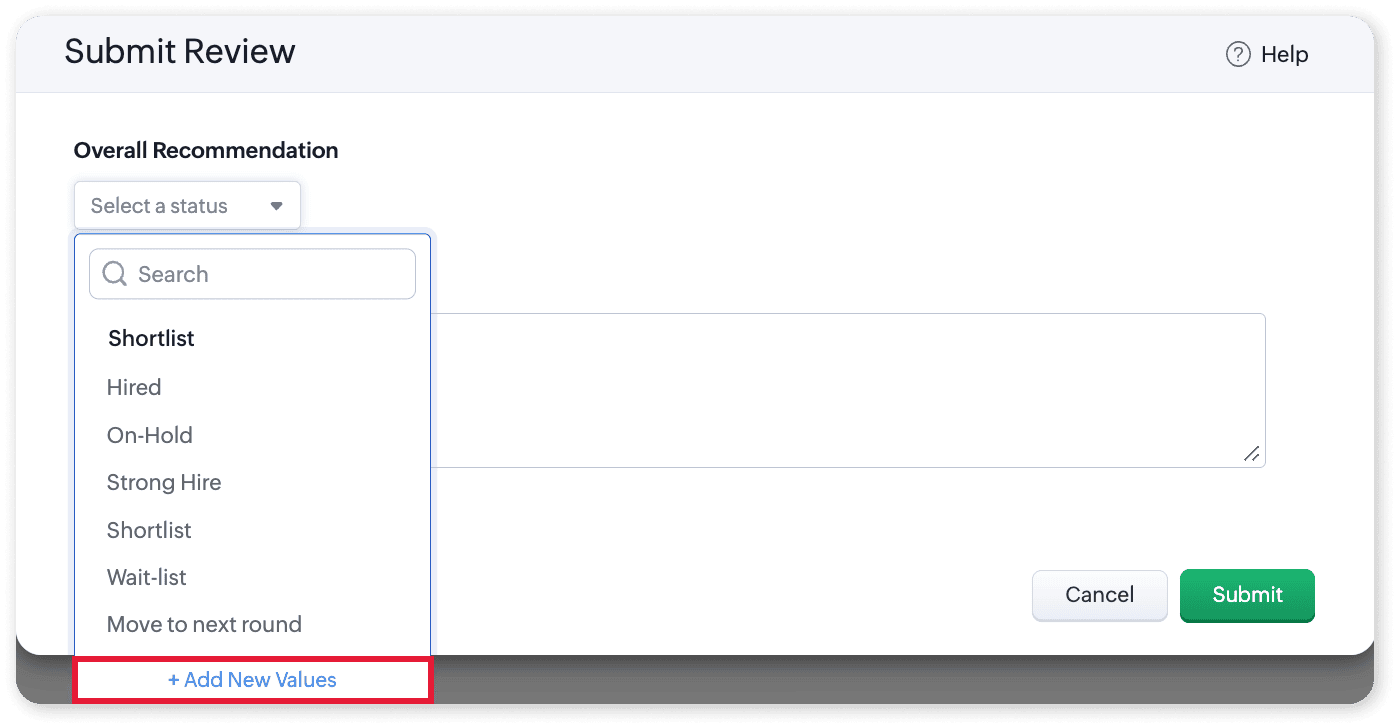 - Alternatively, when you're cancelling or submitting an evaluation for an interview, you can add custom reasons by clicking + Add New Values in the Overall Recommendation list