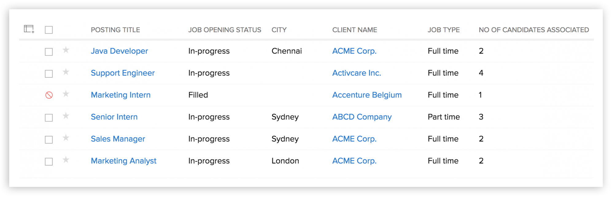 The Job Openings list view displays the jobs one after the other in rows and columns. The list view is helpful when you wish to see the maximum details of your job openings at one glance. For example, you wish to see the job openings, the job opening owner, revenue, closing date, stage, etc you can customize the list view columns and view all the jobs and their details in a single page, one after the other.