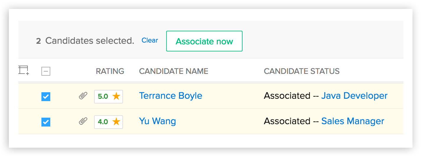 - Select the candidates to be associated. Select Actions > Associate Job Openings.
