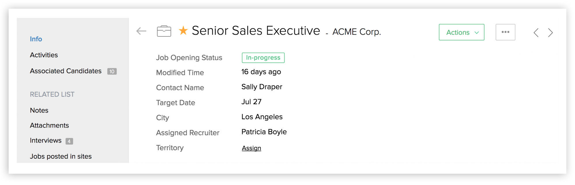 - In the Job Openings Details page, the associated candidates, if any, are displayed.