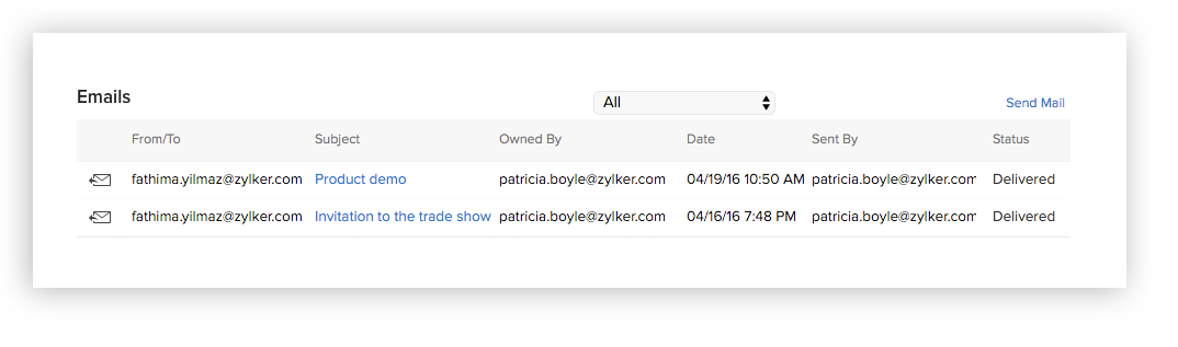 - For users who have activated the Zoho Mail Add-on - From a job opening, if you send an email to the related contact, the email will be associated and listed under the contact's Email Related Lists.