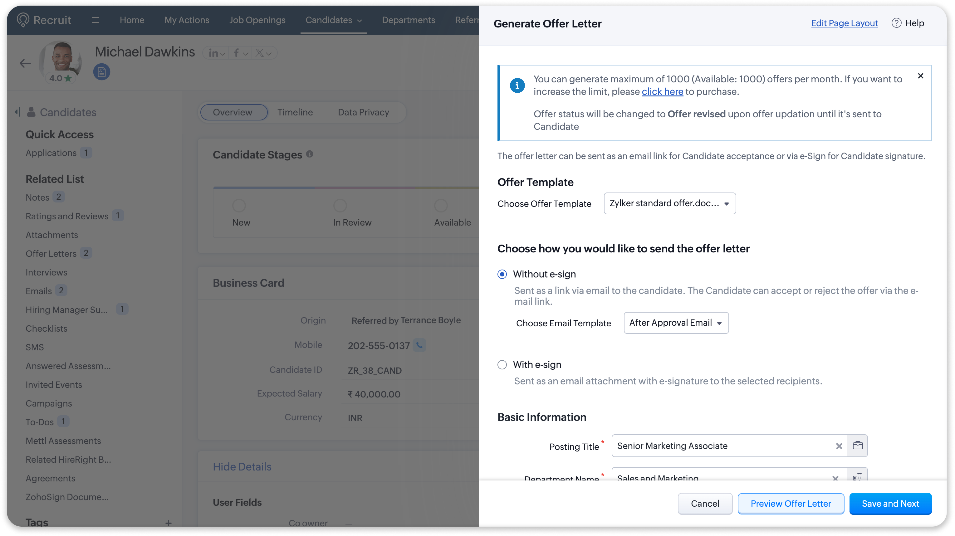 Fill-in details in the Generate Offer Letter section and click Save and Next.