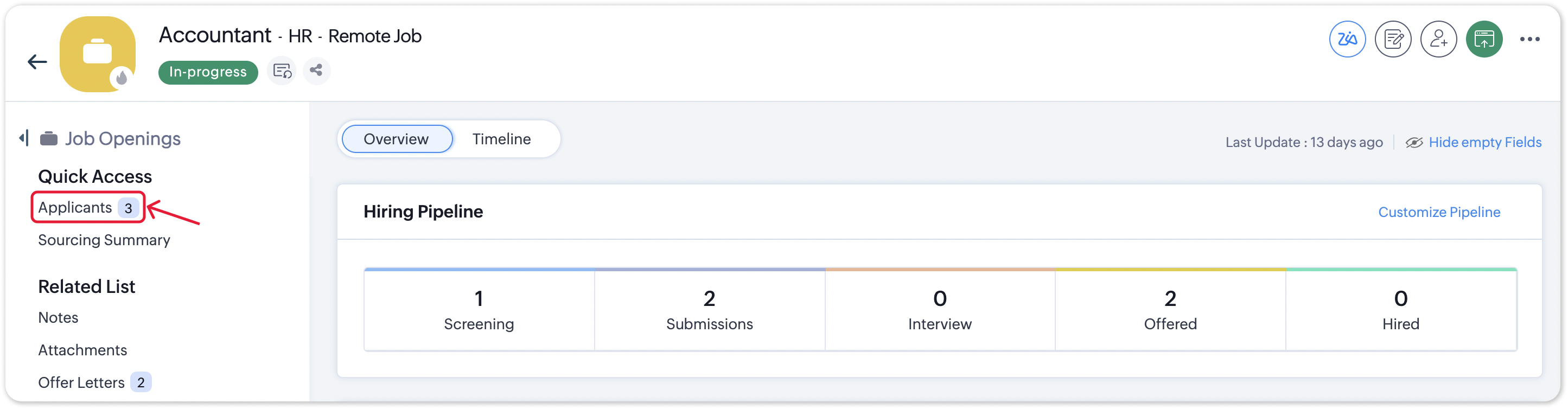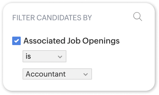 - Go to the Candidates module and filter candidates based on their associated job opening from the left-panel.