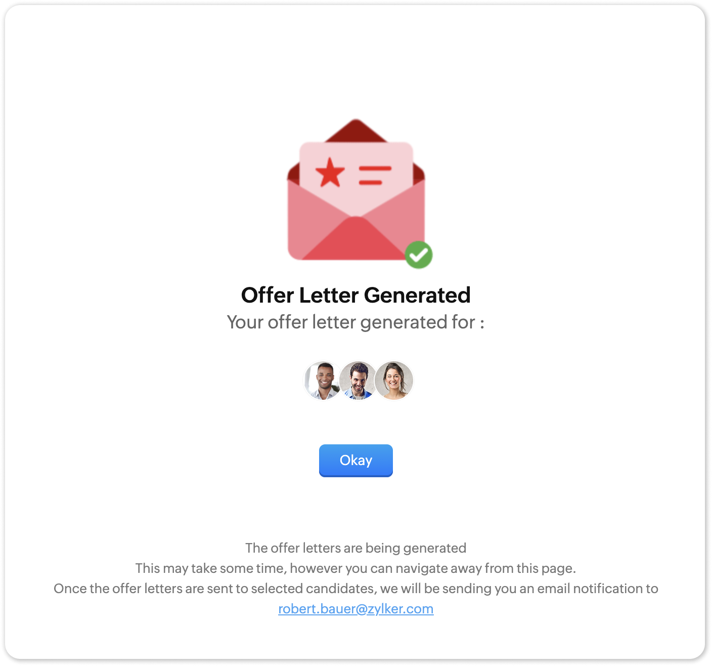 In Zoho Recruit, you can generate offer letters for multiple candidates at once from three places, namely;