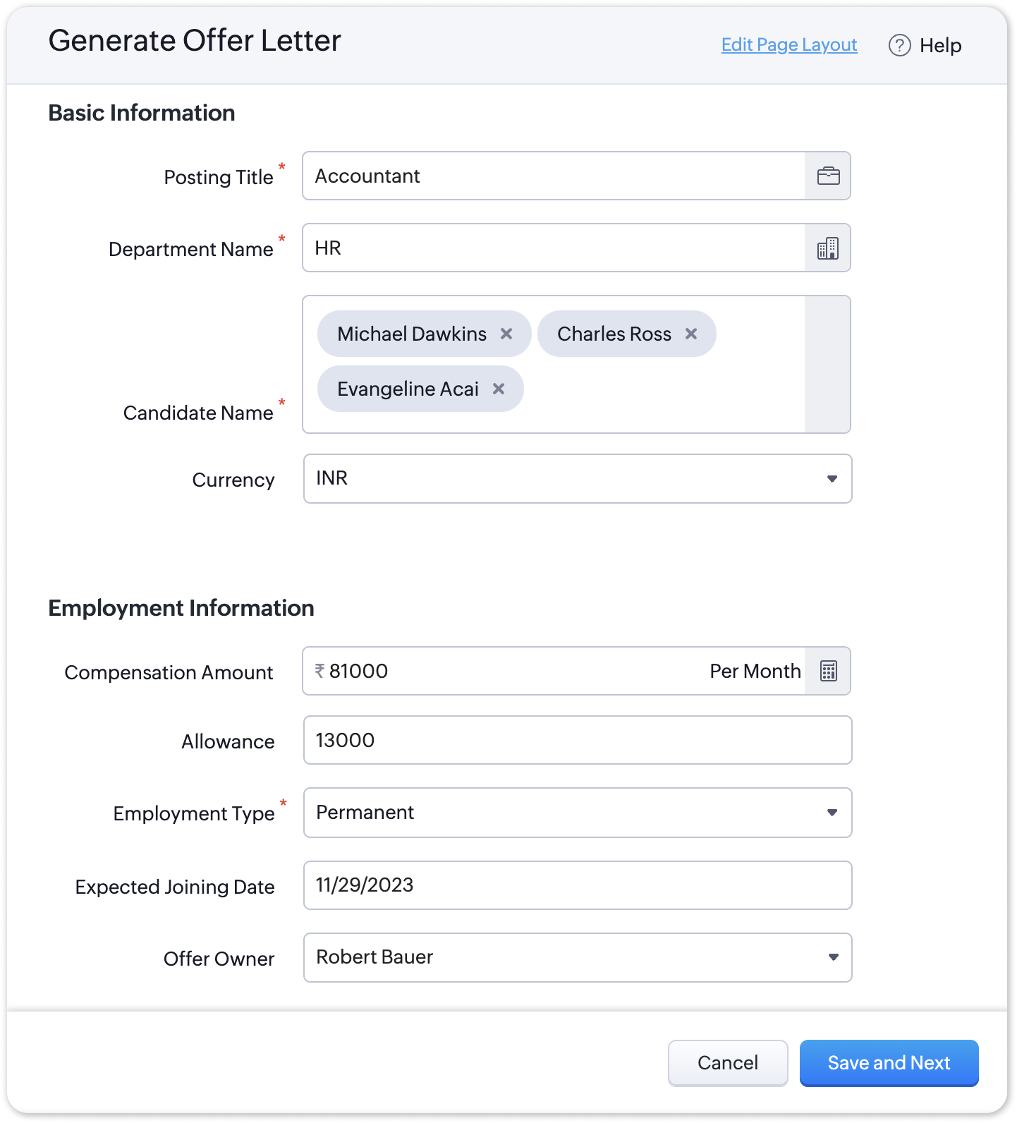 - Enter details relevant to the offer (compensation amount, allowance, expected date-of-joining, etc.).