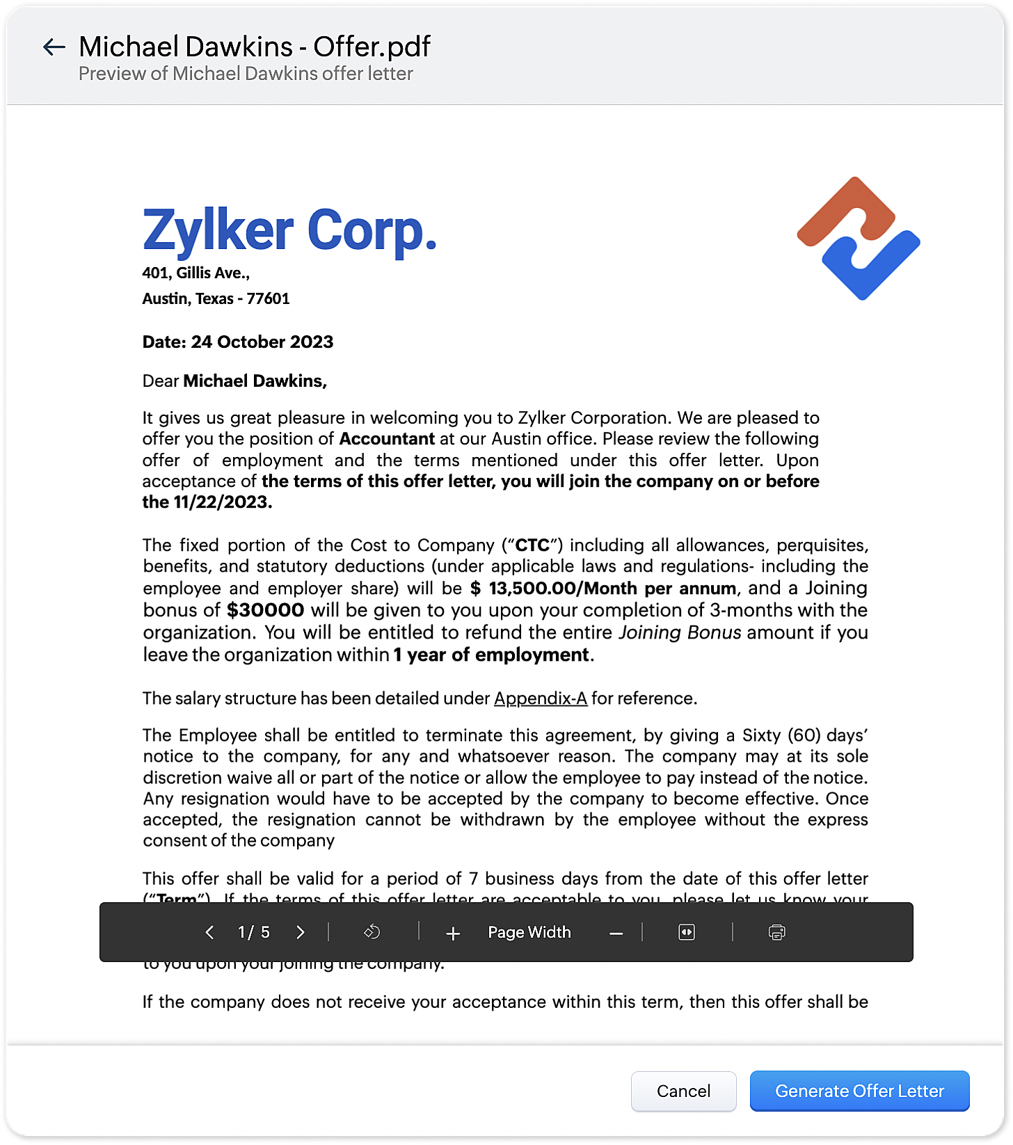 - You can now preview the offer and proceed by clicking Generate Offer Letter.