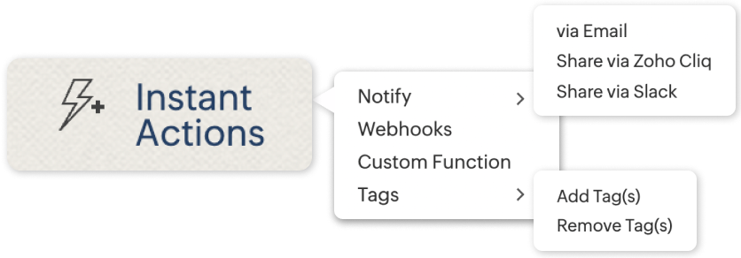 - Notifications: Send instant emails and messages on Slack & Zoho Cliq.