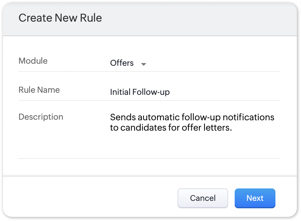 Zoho Recruit's Workflows feature allows you to automate actions within the Offers sub-module based on predefined criteria. Below are the steps to create a workflow for the Offers sub-module, along with the configurable options for triggering and scheduling actions.