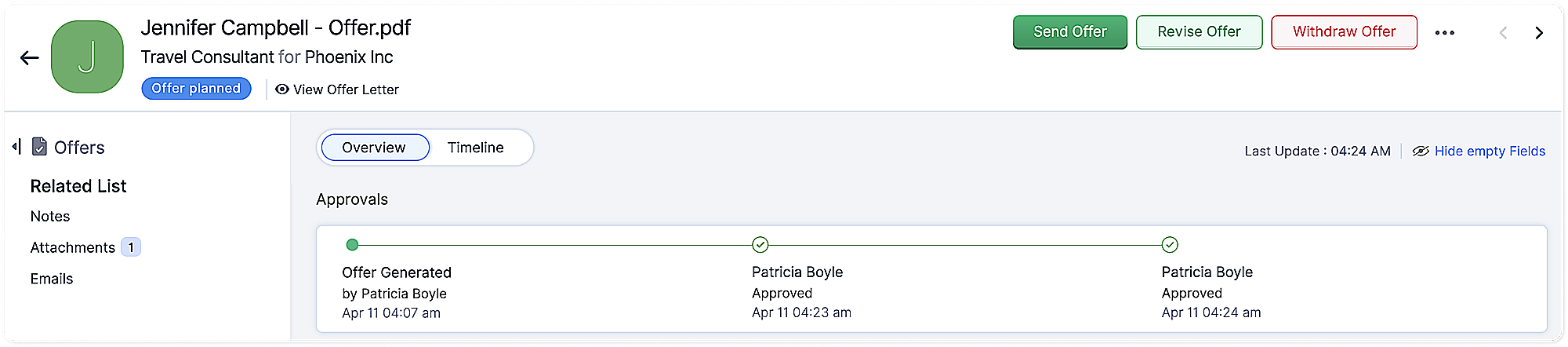 Once an offer receives the necessary approvals, the Send Offer button becomes active, allowing you to initiate the communication process effortlessly. This straightforward process ensures that the approved offer reaches the candidate promptly and accurately, marking a significant milestone in the hiring journey and reinforcing a positive candidate experience.
