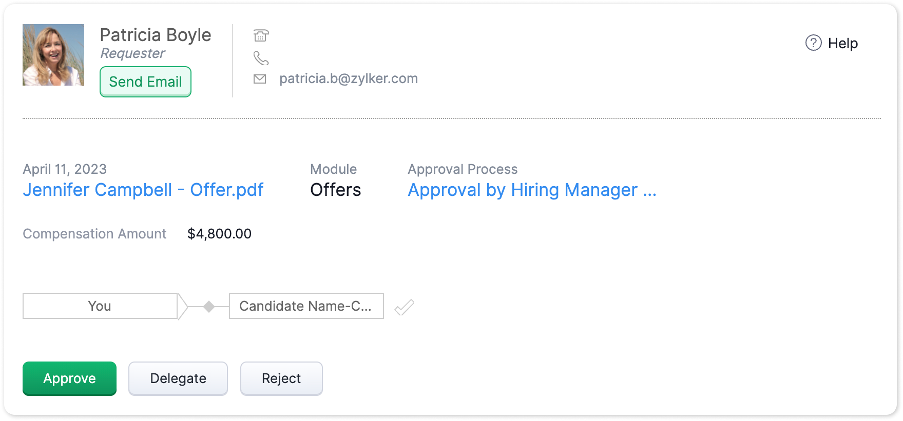 Designated approvers can provide feedback and choose to approve, delegate, or reject the offer. Once approved, you can send the offer to the candidate and doing so will automatically update the offer's status to Offer Made. This allows for seamless tracking within your team without disturbing any existing processes. Learn More Approval Processes