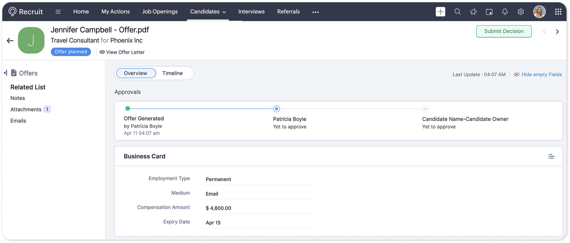 Zoho Recruit lets you configure approval processes for offers, enhancing organizational control. Upon generating an offer, if it meets the criteria requirement, the offer enters the approval process where designated approvers, such as hiring managers, can review and submit their decision.