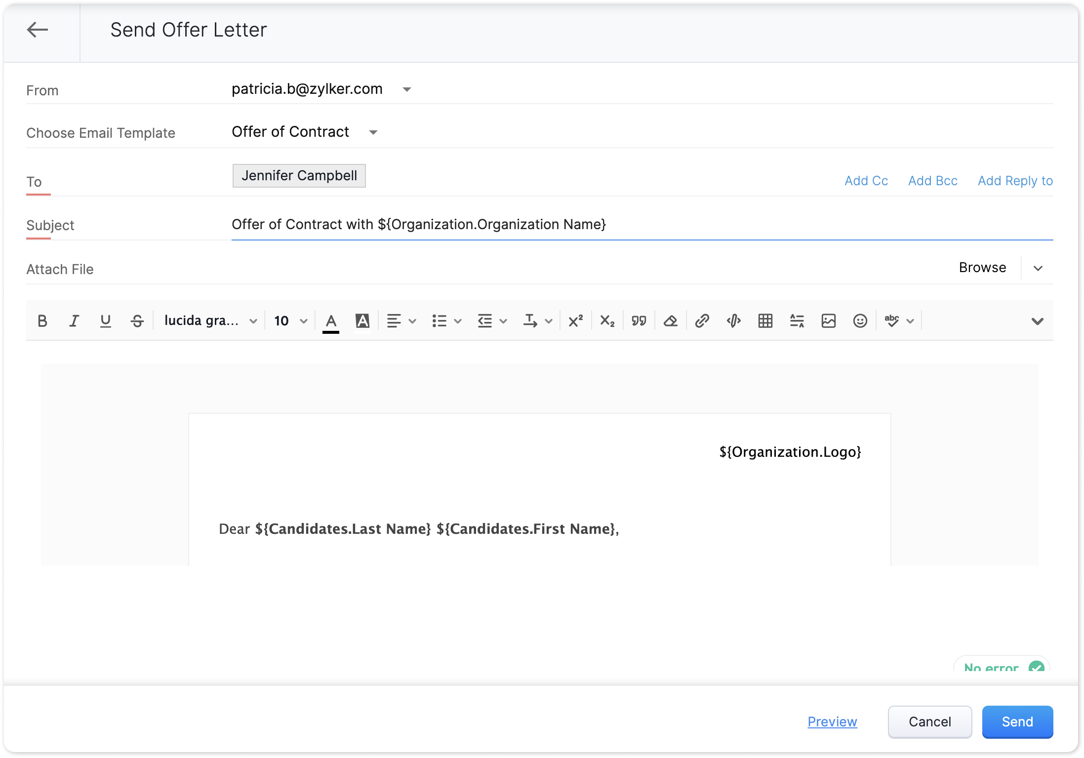 - The offer letter is sent as a link in the email. Upon clicking the link, the offer letter can be viewed by the candidate, which can be accepted or declined.