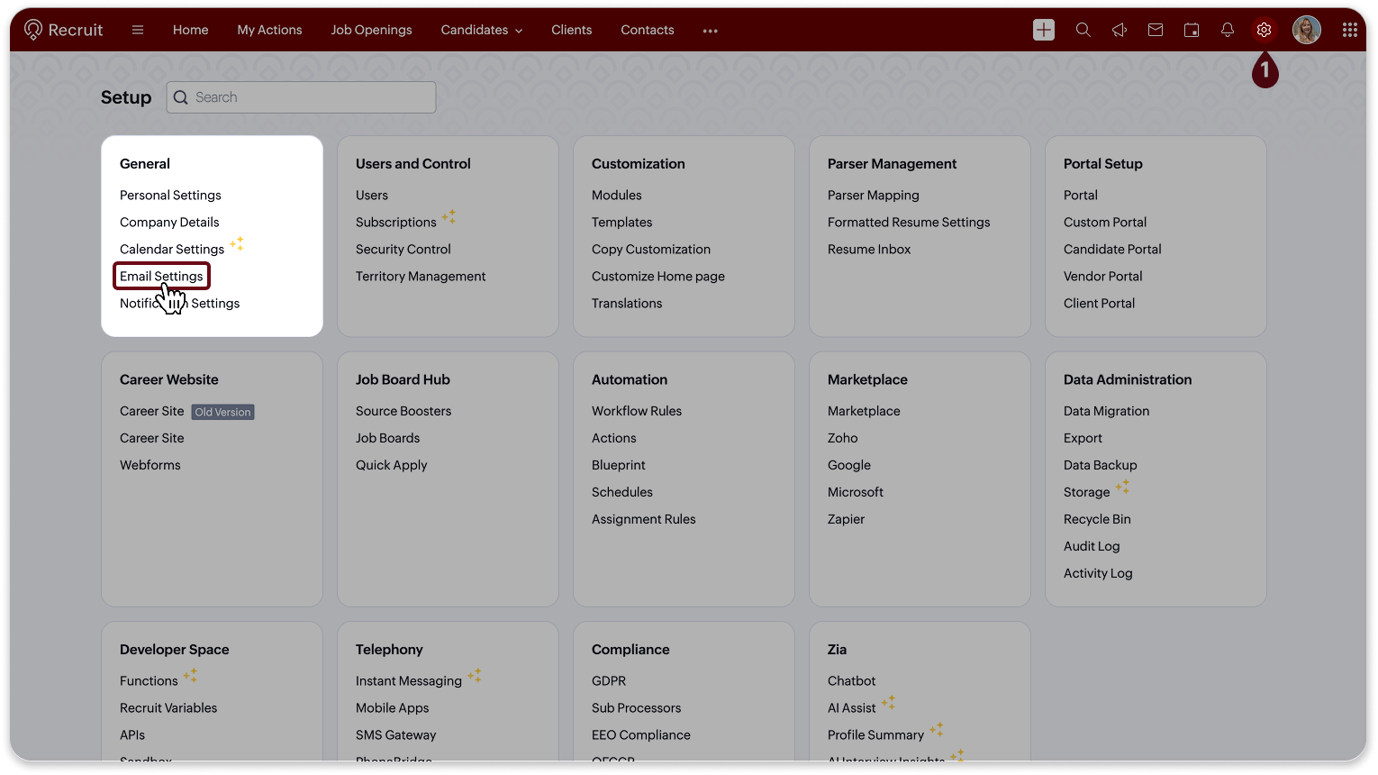 - Recruit searches for the recipient’s email address in the Candidates module.