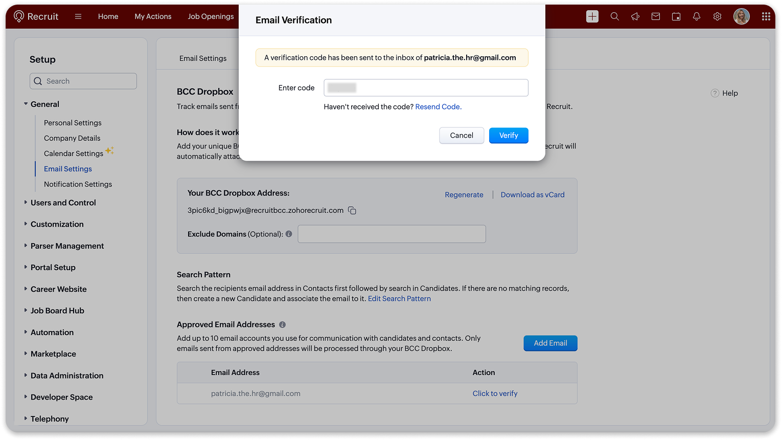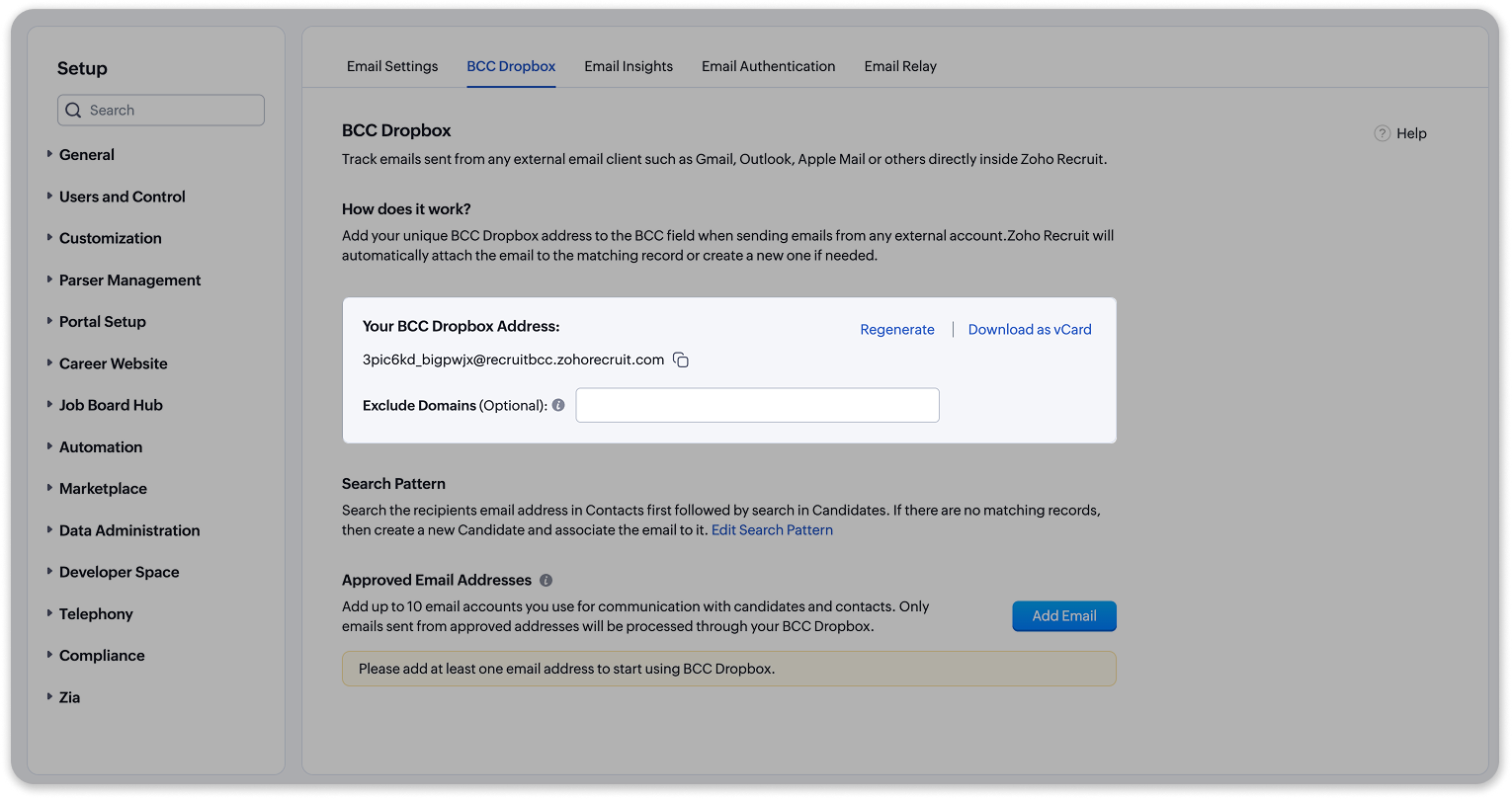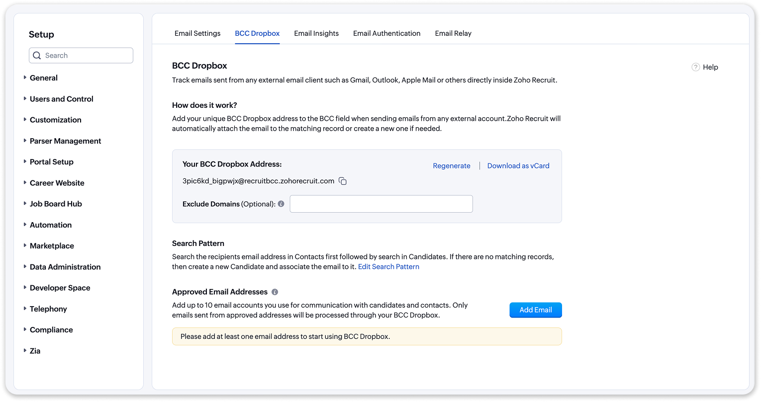BCC Dropbox helps you track emails sent from external email clients such as Gmail, Outlook, or Apple Mail directly inside Zoho Recruit. By adding your unique BCC Dropbox address while sending emails, all candidate and client communications are automatically recorded against the relevant records in Recruit.