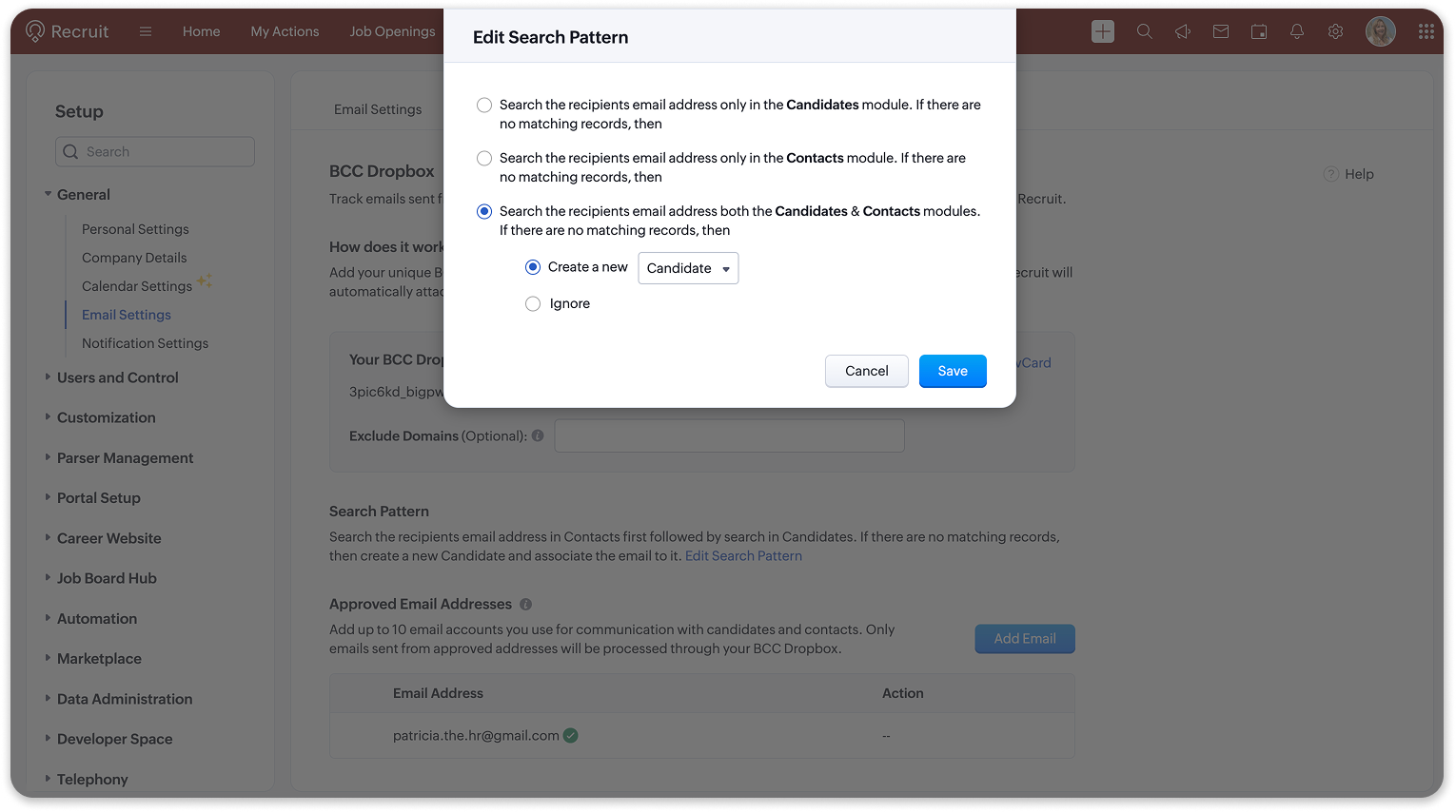The Search Pattern determines how Zoho Recruit identifies which record an email should be linked to.
