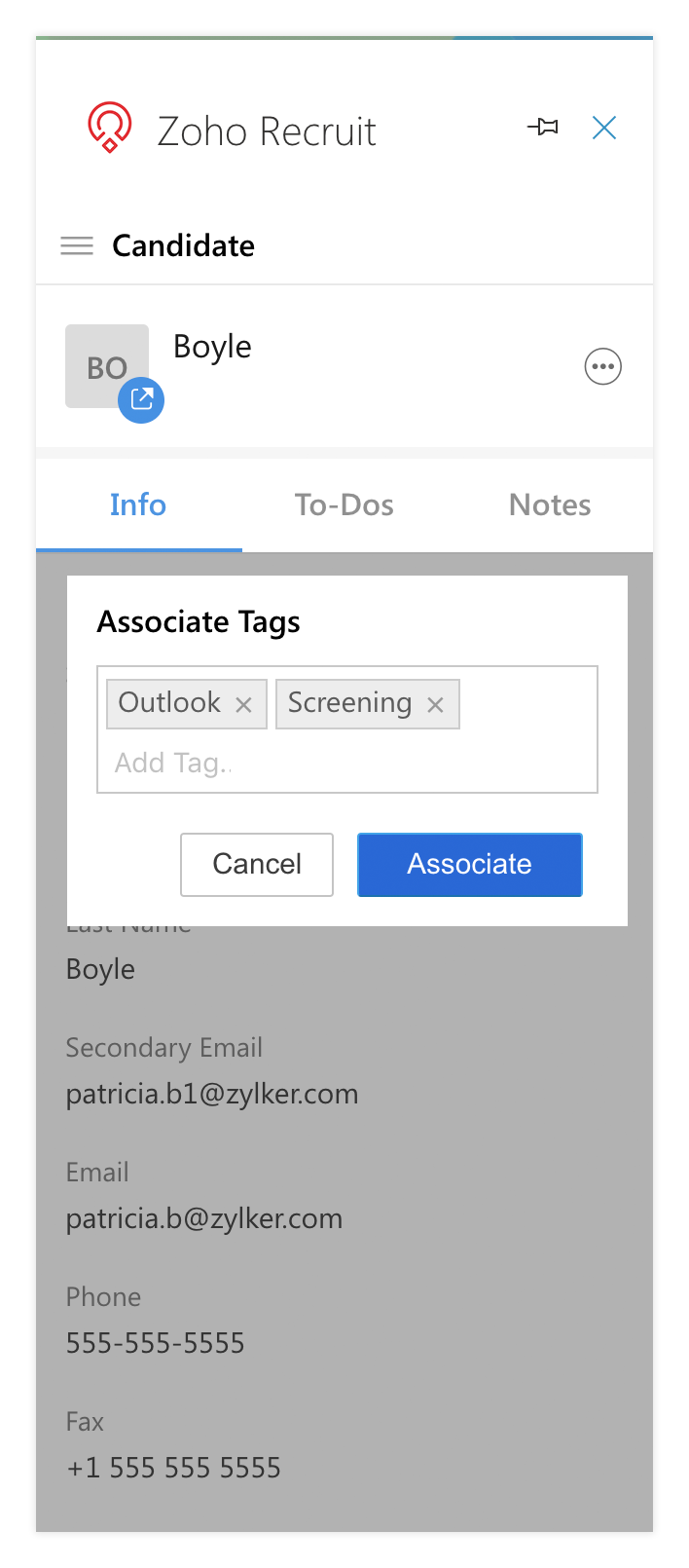 Bring your Microsoft Outlook email conversations and associate with a candidate or a contact in Zoho Recruit. Additionally, you can also add in any attachments from email.