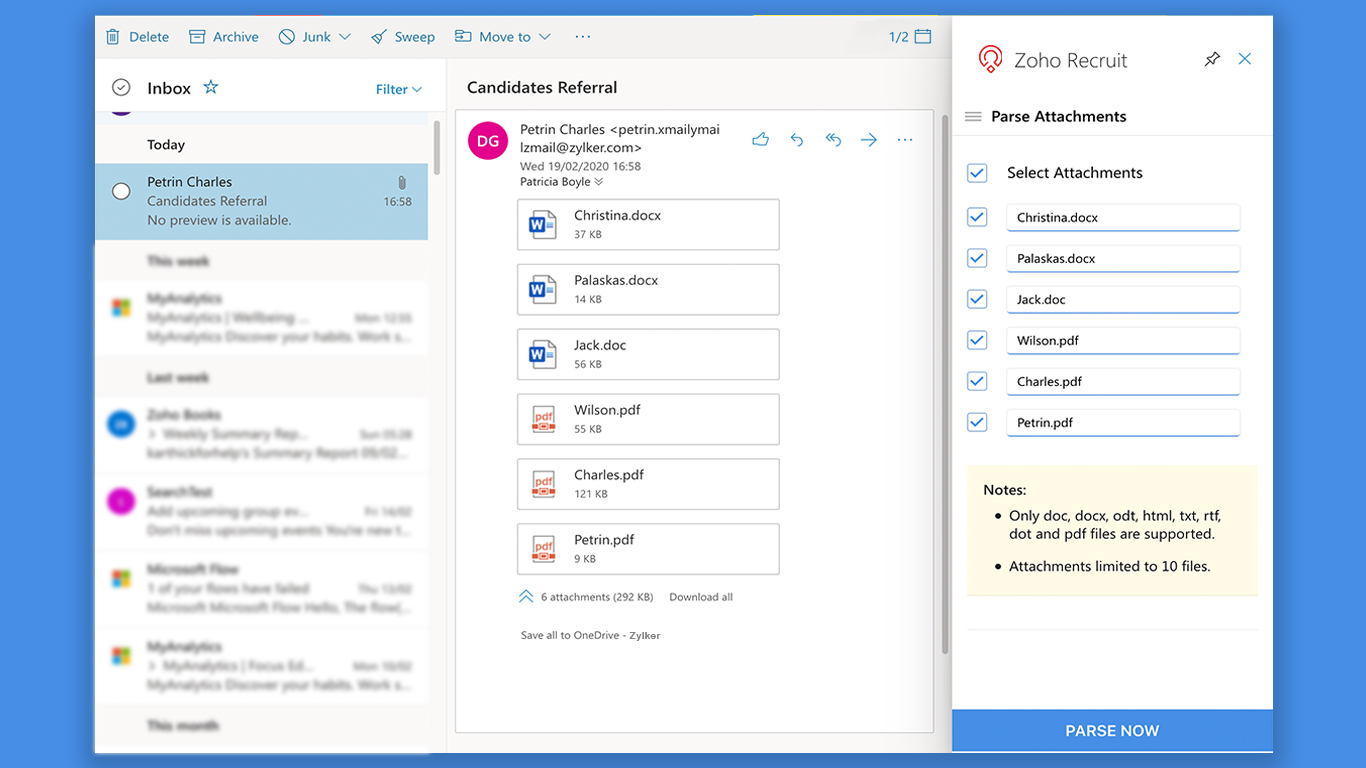 1. Parse resumes from your Outlook inbox and add them as a candidate in your Zoho Recruit database. The Outlook plug-in lists the attachments from your mail when you select Parse Attachments in the drop-down.
