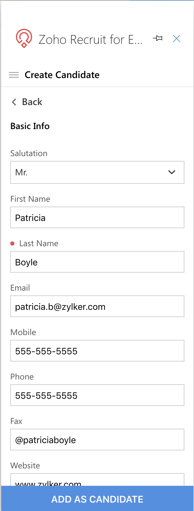 3. If the user is not in your Recruit account, the  Add as Candidate or Create Contact option will be displayed.