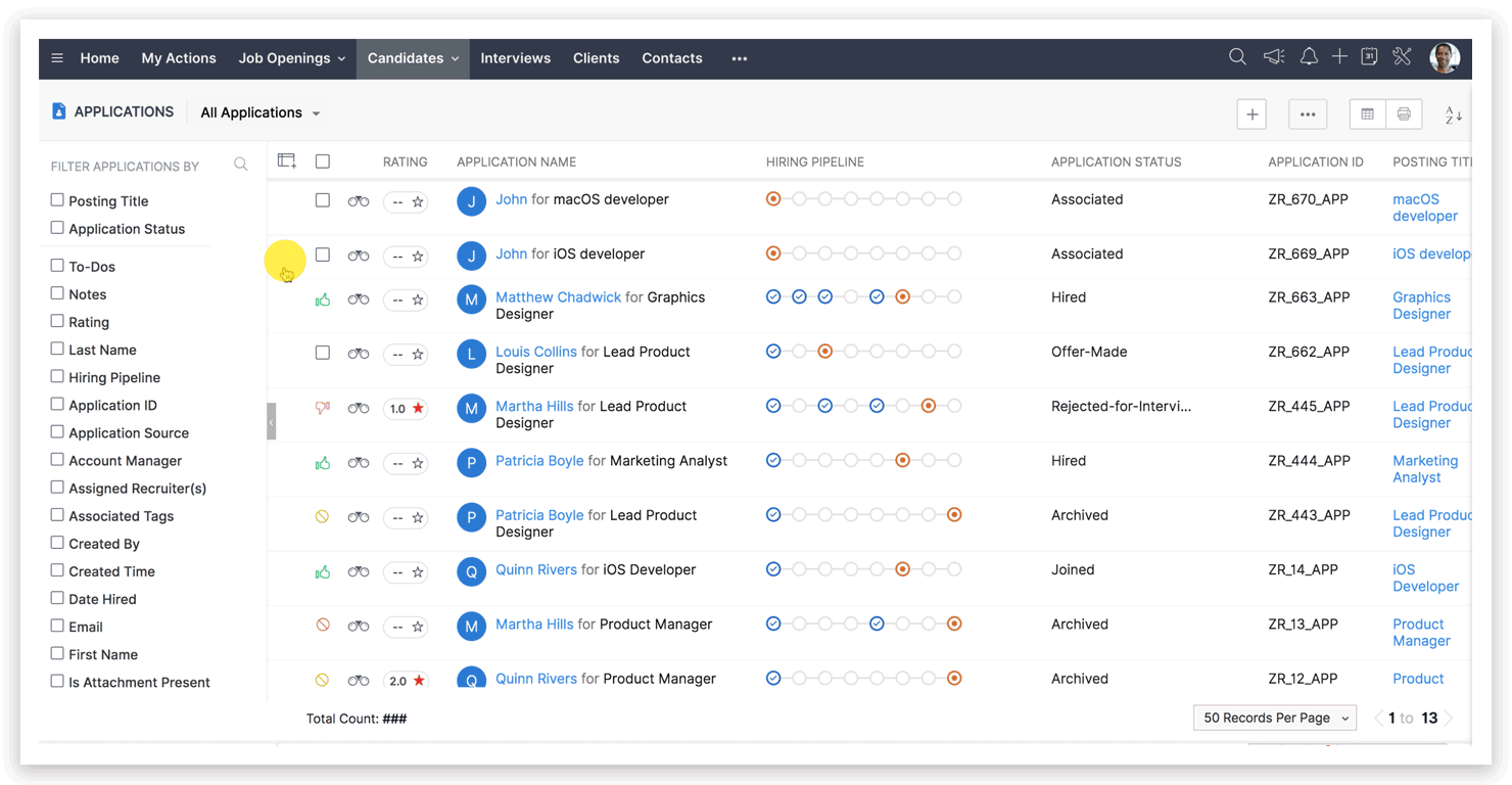 Say John is associated for both macOS and iOS developer jobs in your company. As he progresses through your hiring process, his application to iOS developer seems to fit well. In this case, John's iOS developer application will move to Hired, while the other application (macOS developer) will automatically move to Archived.