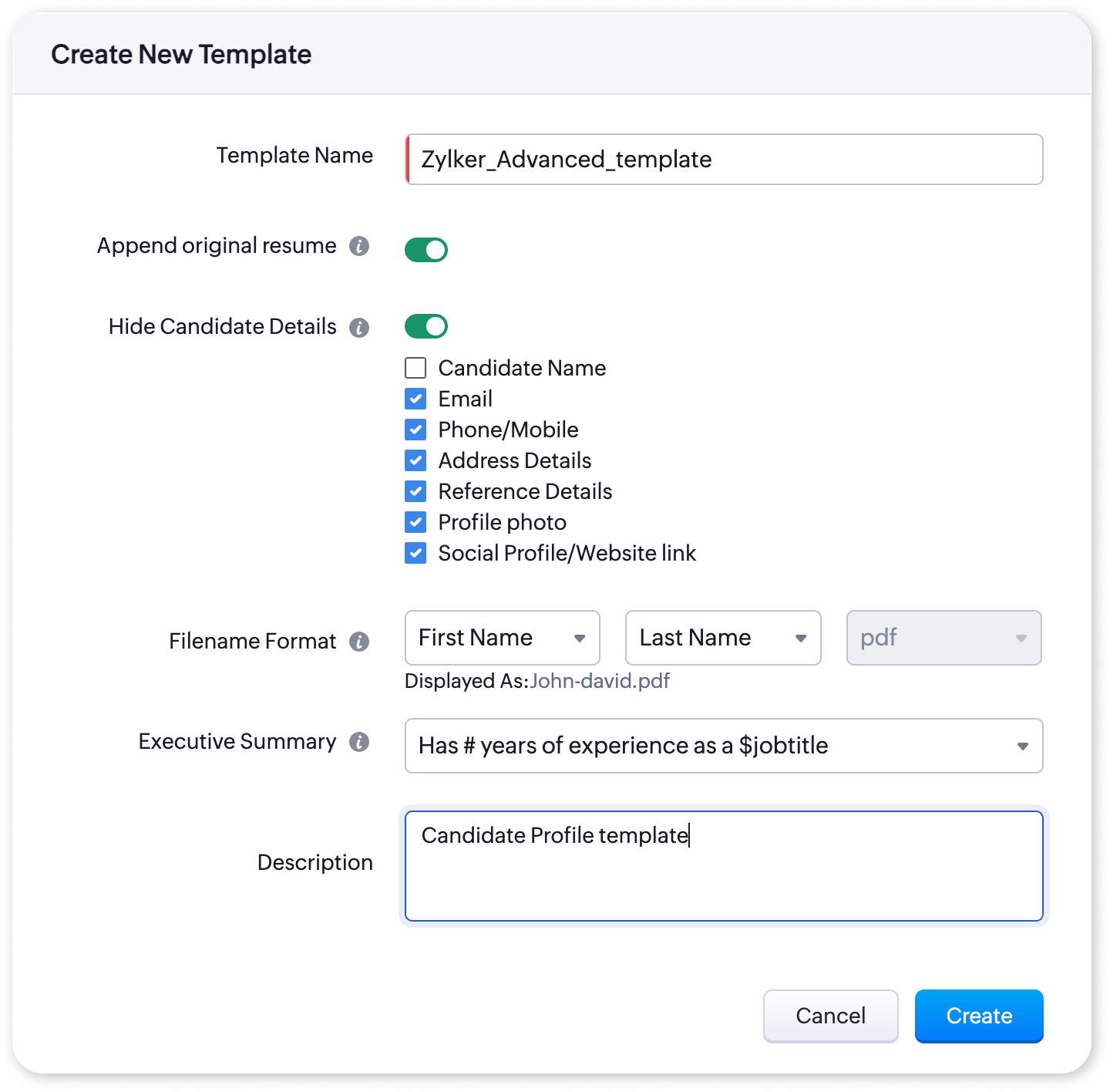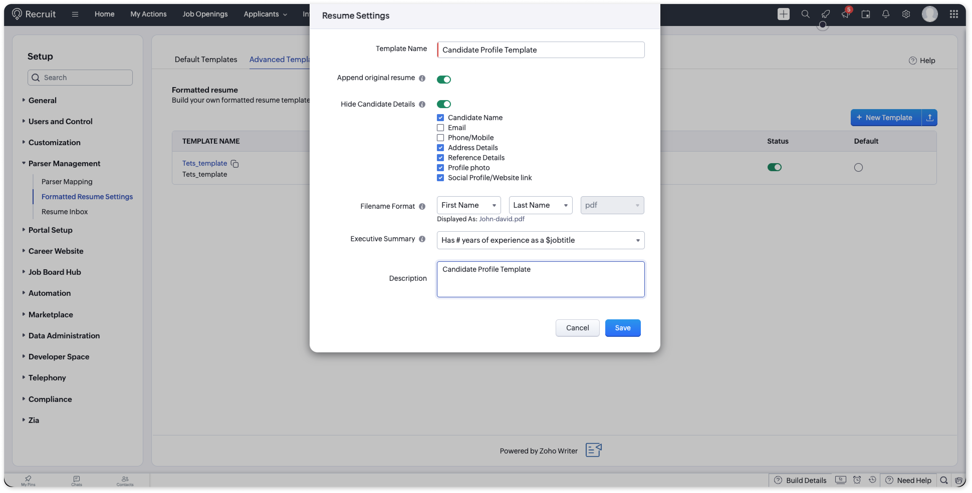 Zoho Recruit's Custom Formatted Resume templates let you build and generate personalized branded resumes that show off your brand. Start from scratch or pick one of five pre-built templates from our template library. You can then add merge fields to your template and generate branded resumes on the go!
