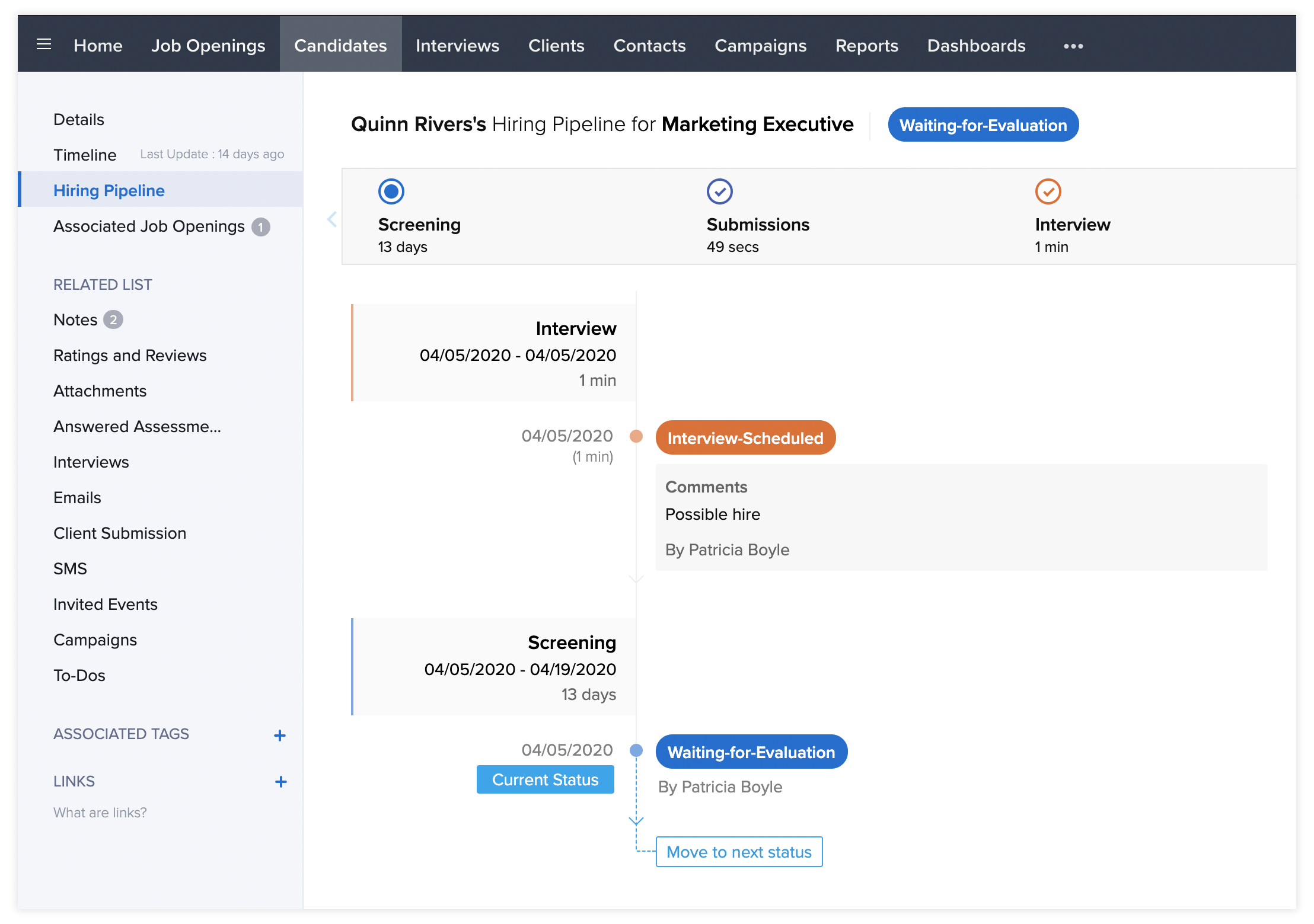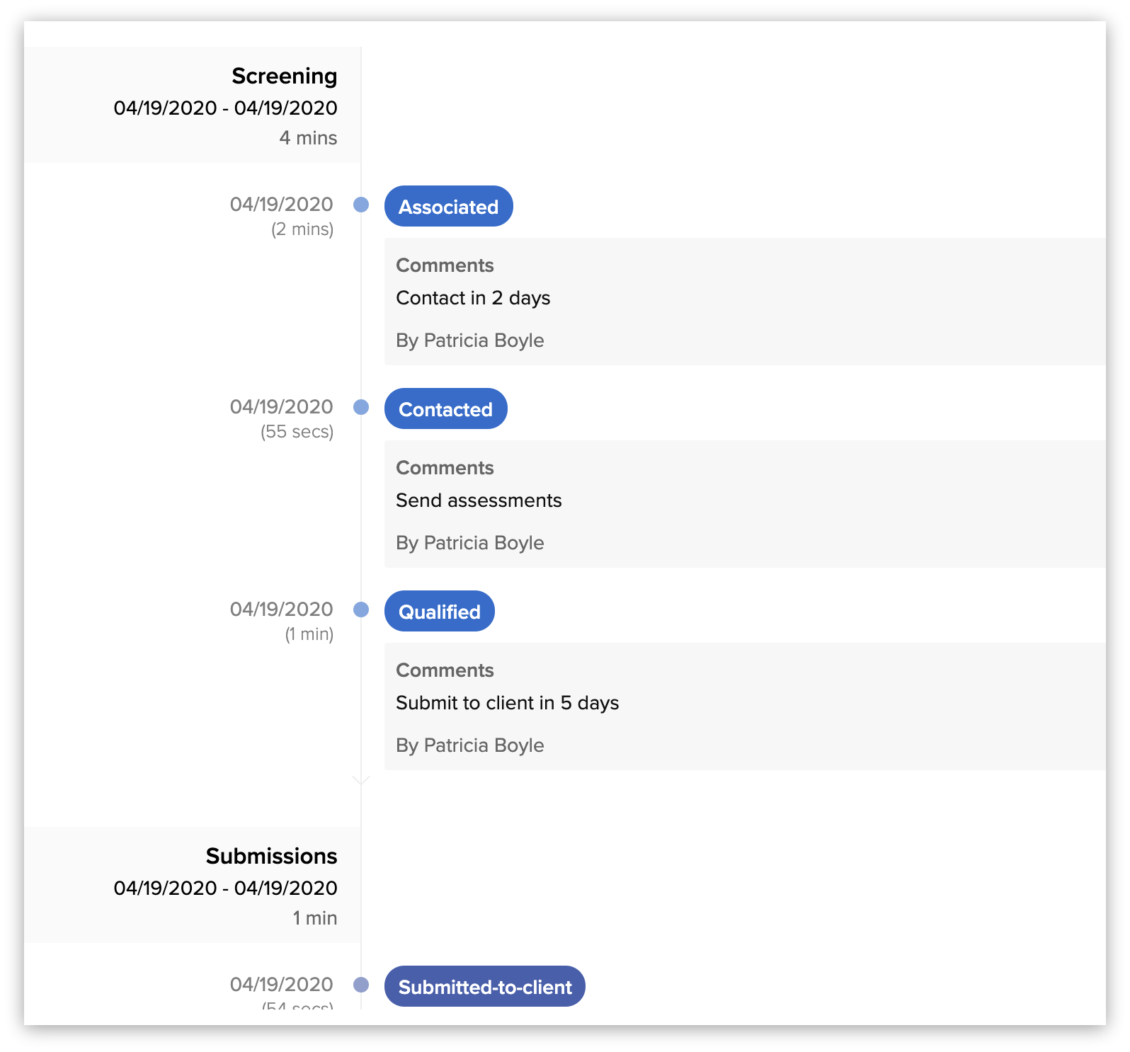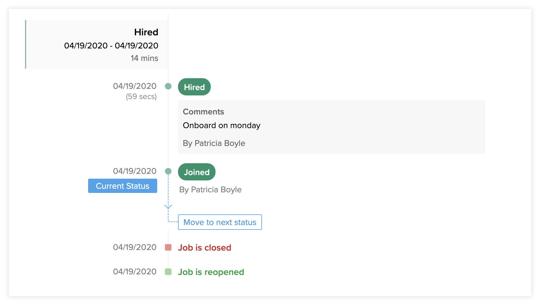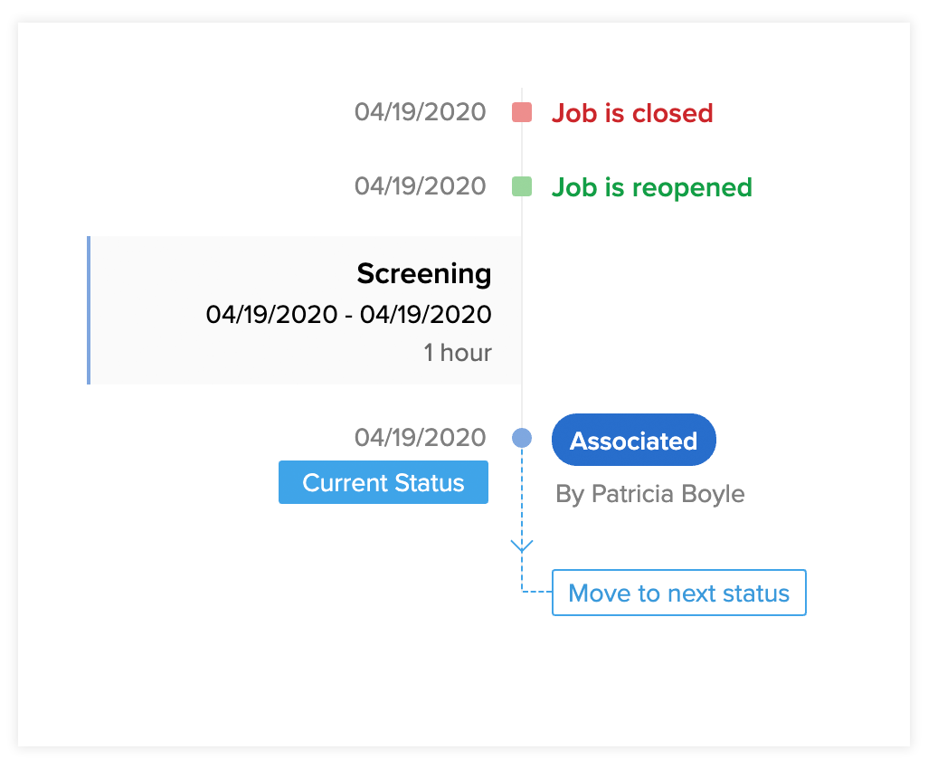1. The comments added to each change of status will be displayed in the timeline. You cannot change the status of the candidate when