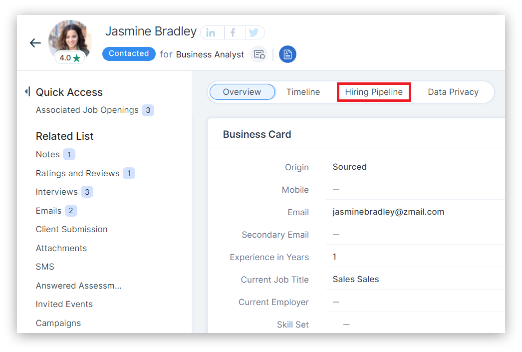 2. In the details page of the candidate record, click  Hiring Pipeline  on the left panel.