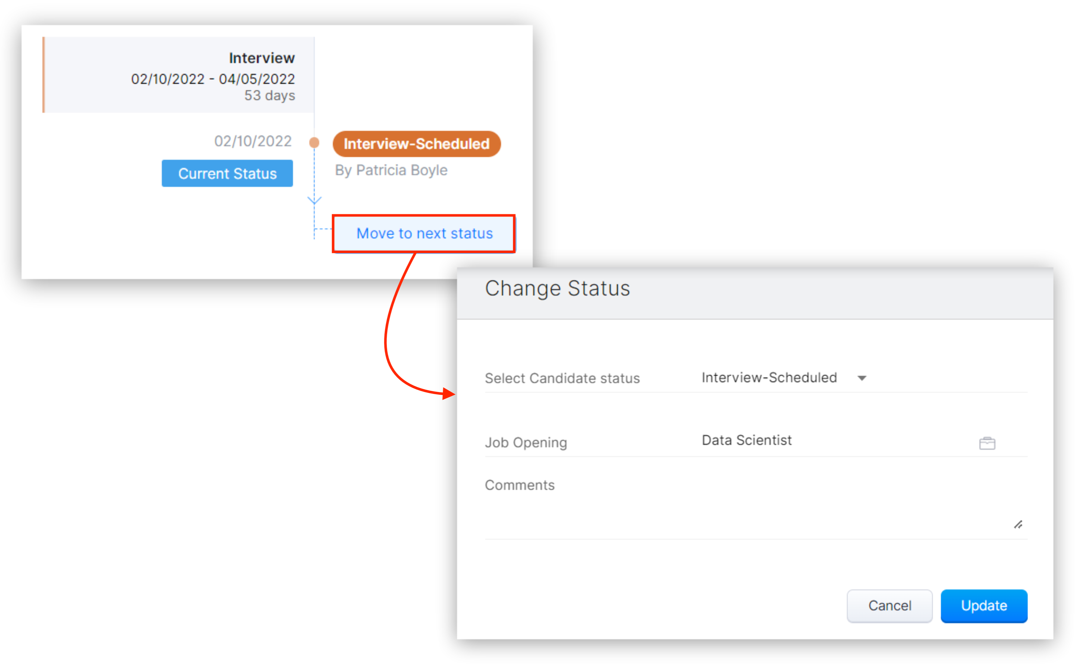 6. Select the new status for the candidate from the drop-down list. You can also add comments for every change of status that you make and click Update.