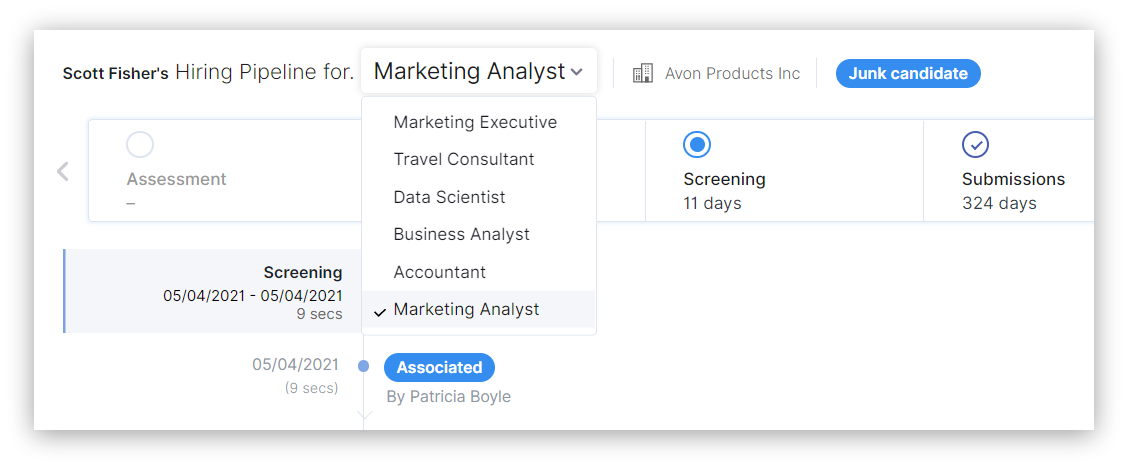 If a candidate is associated to  multiple job openings, you can view the hiring pipeline for every job by choosing the preferred job in the drop-down list.