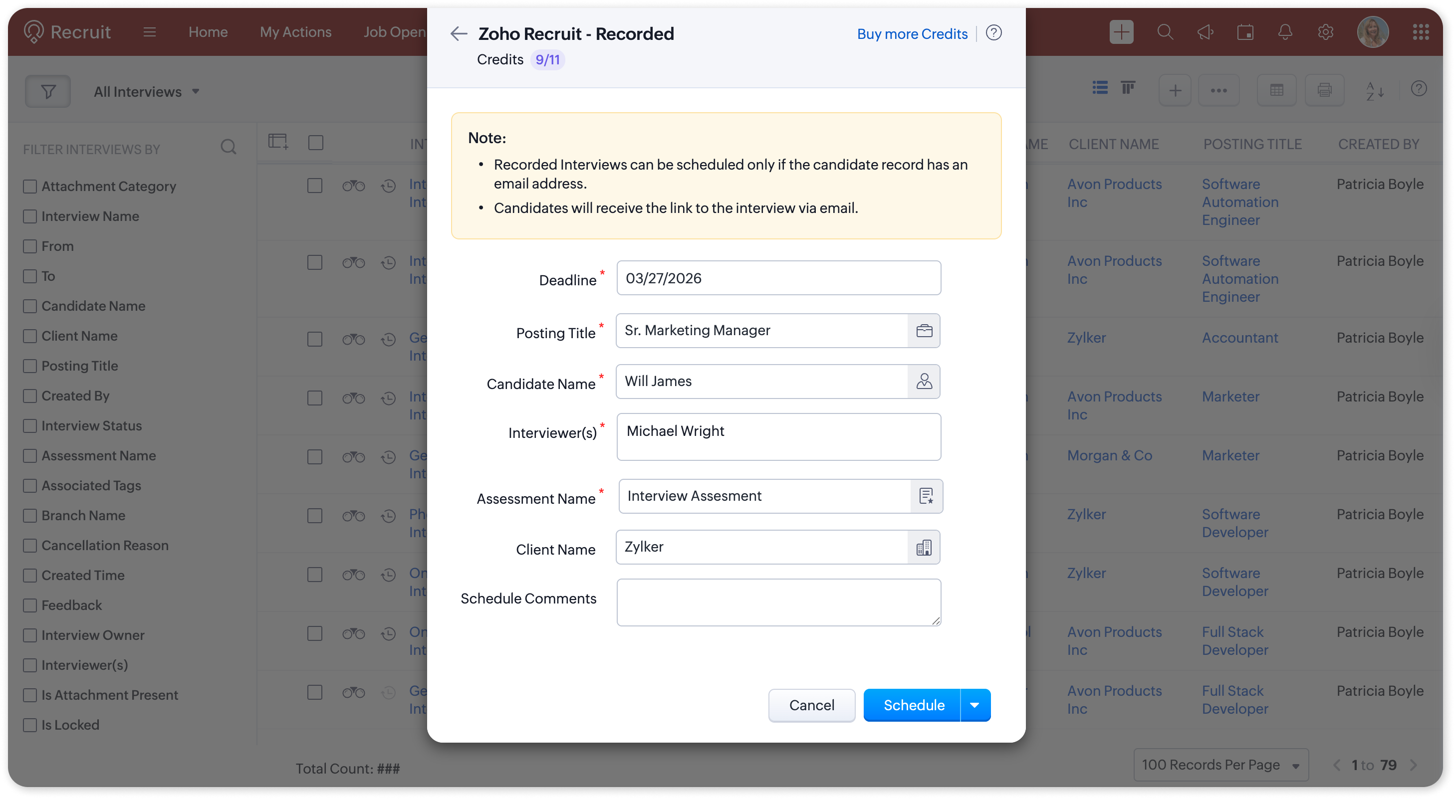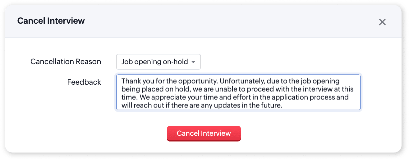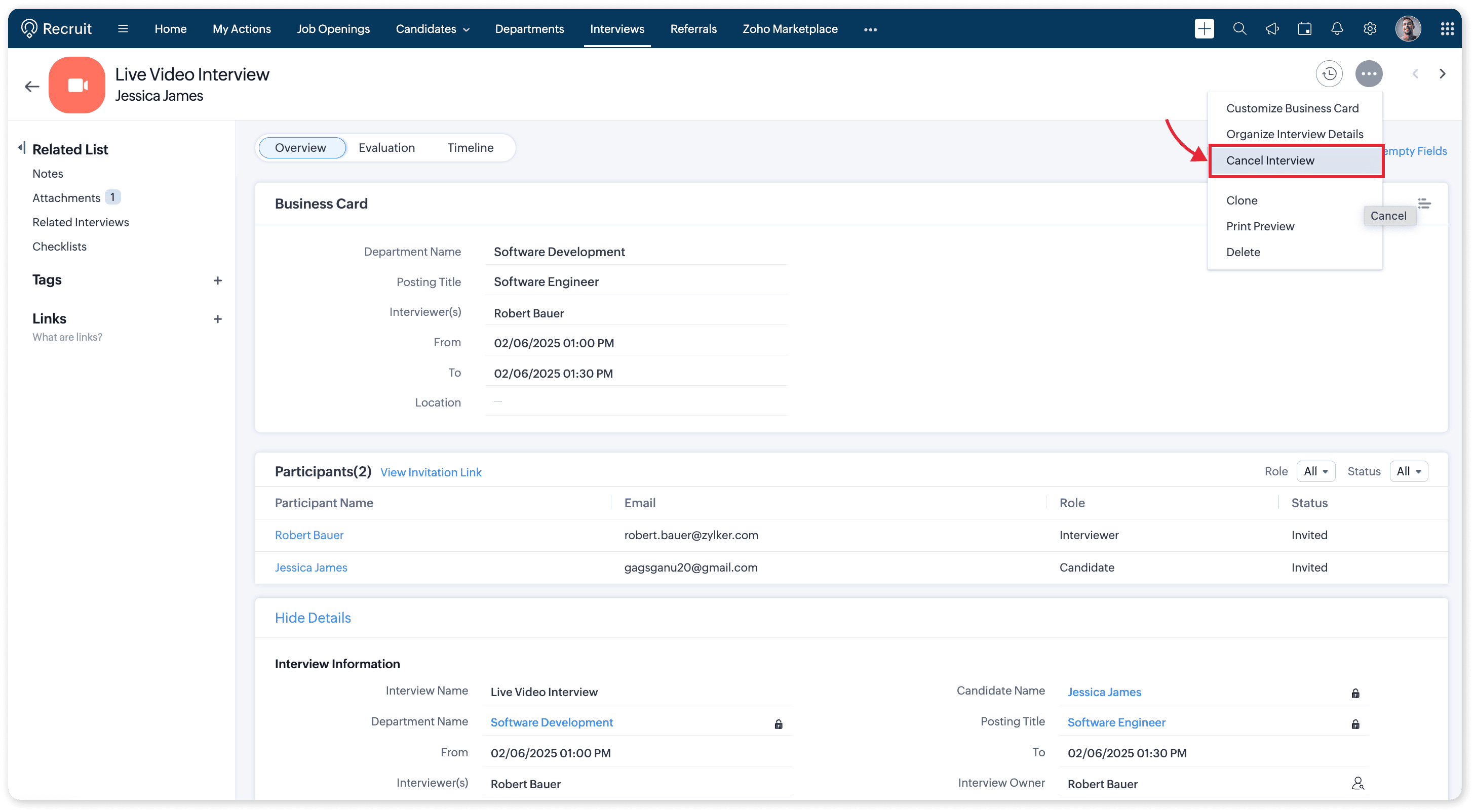 Navigate to the Interview module and choose the interview record you want to cancel.