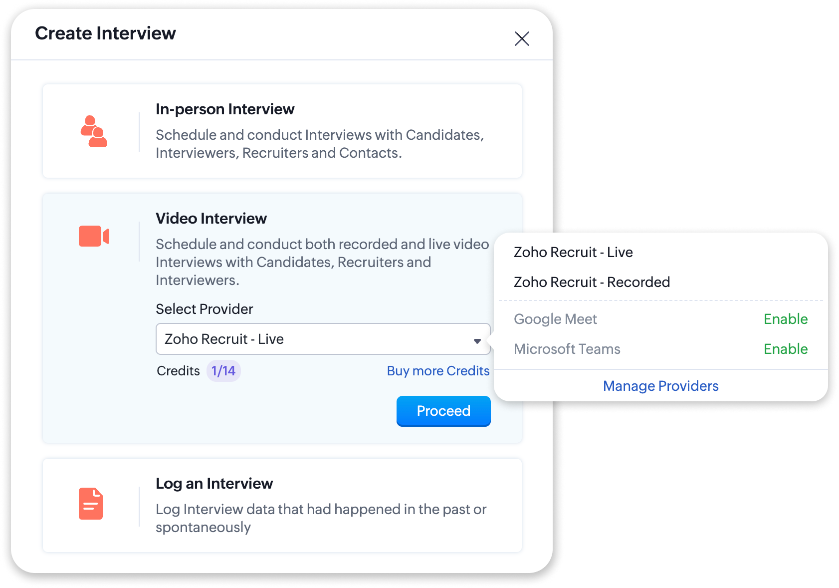 Video interviews operate using video credits. By default, we provide one video interview credit. A single credit allows multiple video interviews for one active job opening. To obtain additional video interview credits, you can purchase an add-on for $12 or ₹600 per month per credit under Profile > Manage Subscription and click Upgrade Users/Add-ons. Click here to see how to purchase additional video interview credits. For more details on video interview credits, visit our FAQ page on Video Interviews