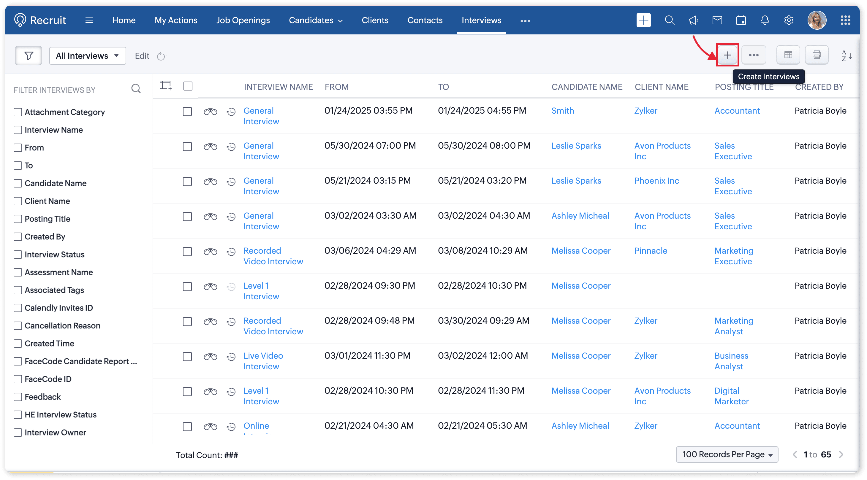 Navigate to the Interviews module and click on the ➕ icon (Create).