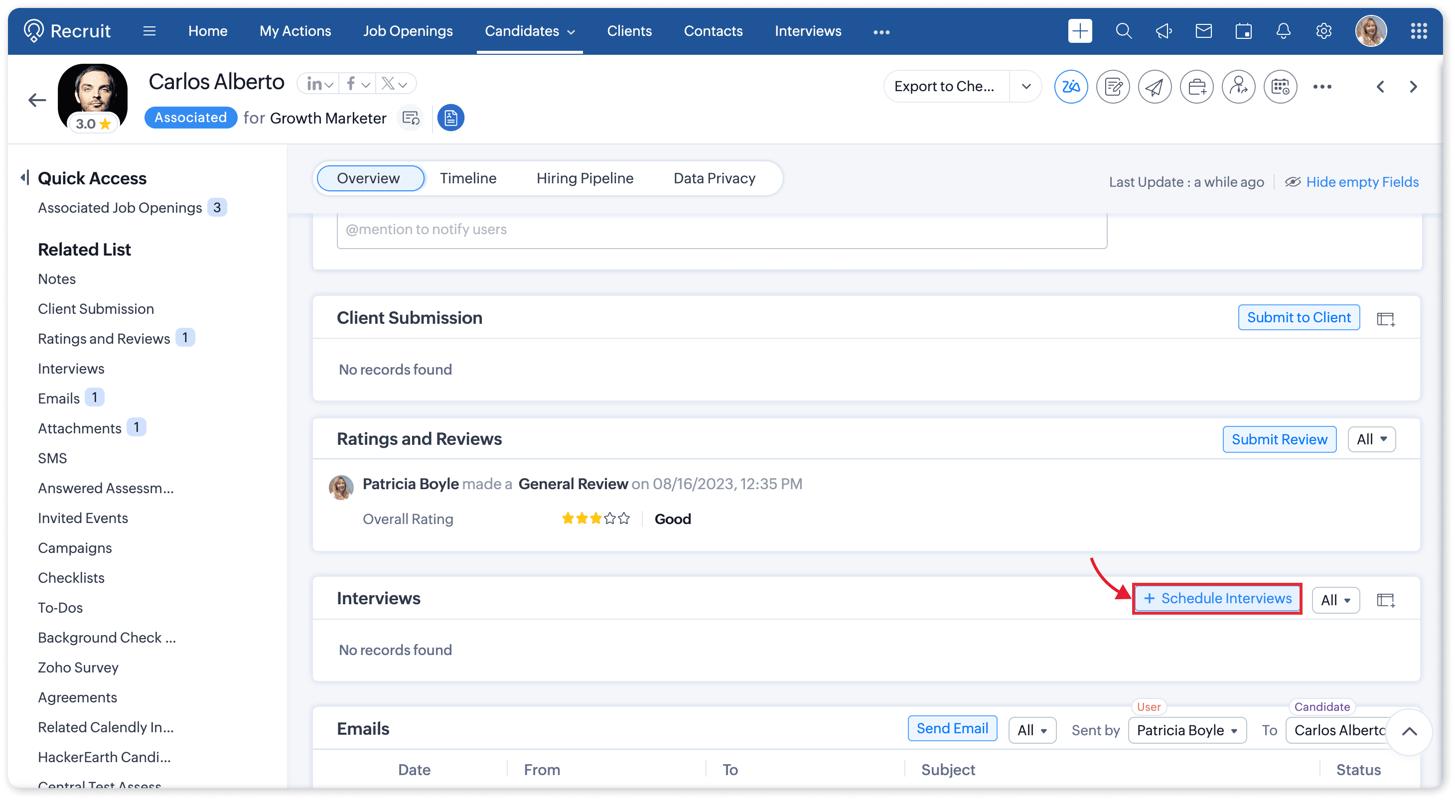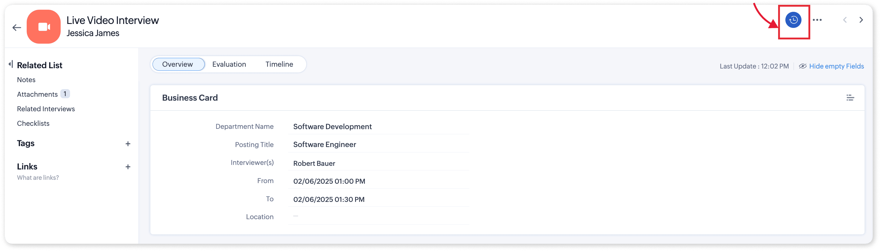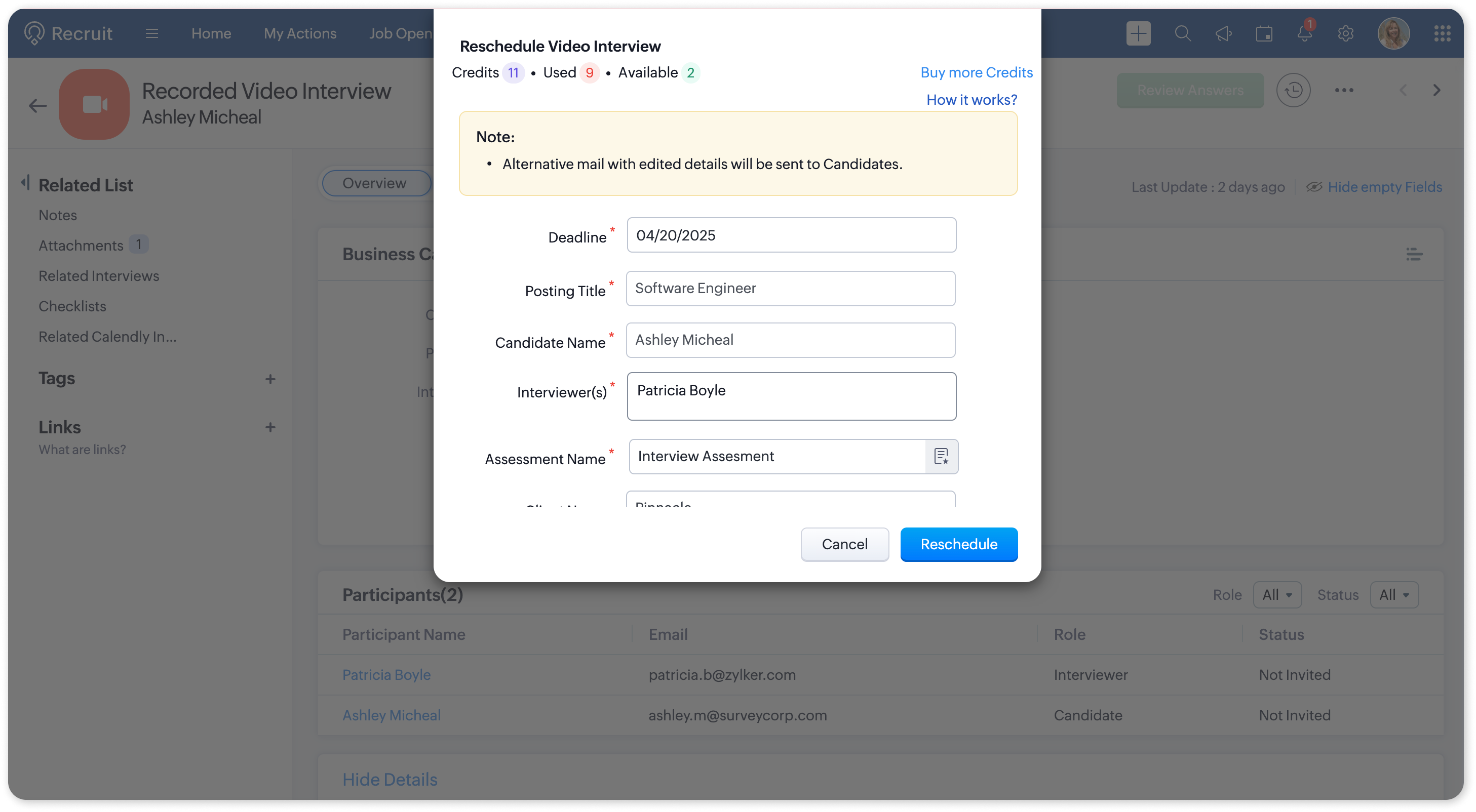 Navigate to the Interview module and choose the interview record you want to reschedule.