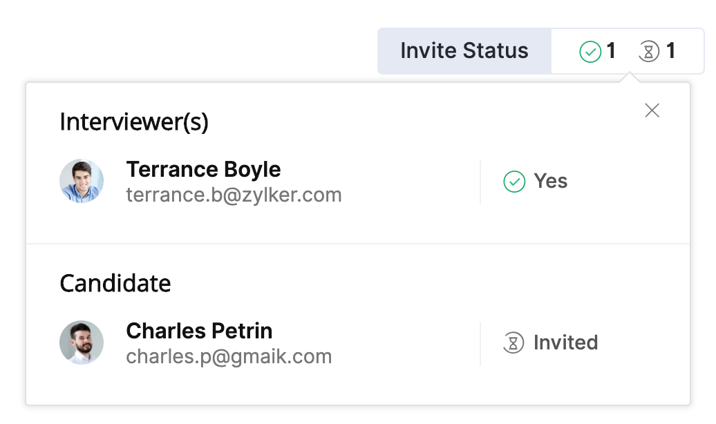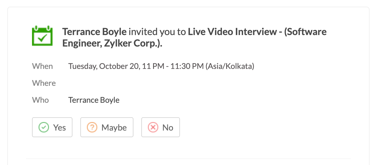 The interview RSVP feature of Zoho Recruit will help interviewers to keep track of their scheduled interviews. You will get up when an invitation is accepted or declined by the interviewer and candidate. You can also see if they fail to respond to the invitation. This information will be visible within your Recruit account and Zoho Calendar.