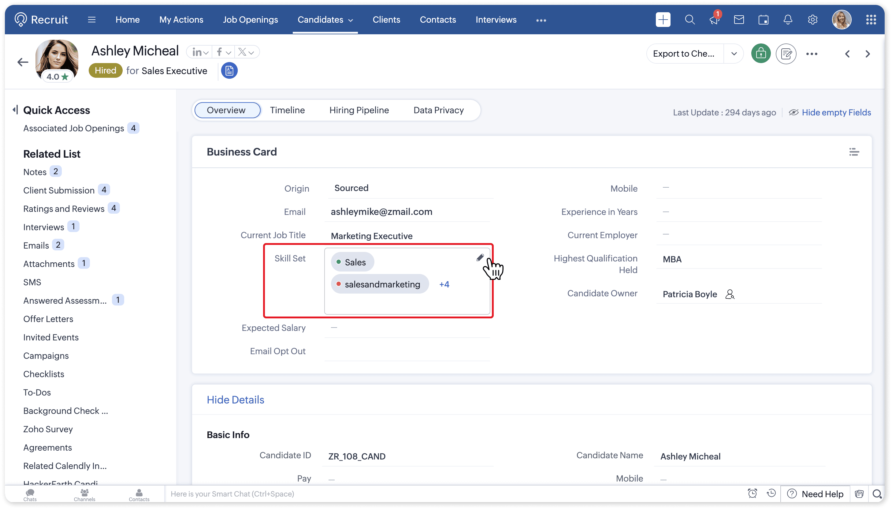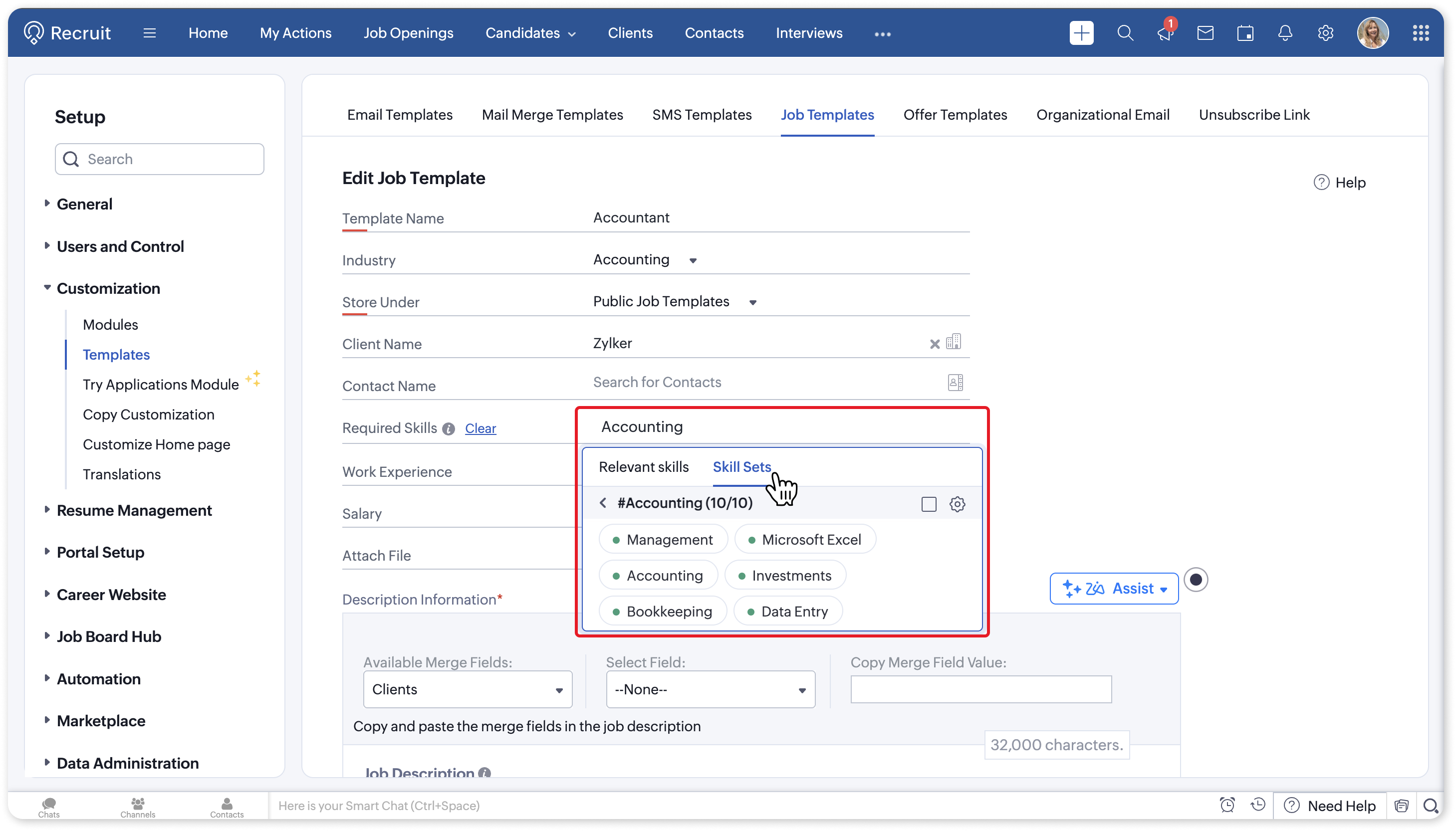 In Zoho Recruit, skills are used to provide additional depth to Candidates and specify requirements for Job Openings. To make the process easier, you can use default or custom skill sets to associate multiple skills to a job opening at once.