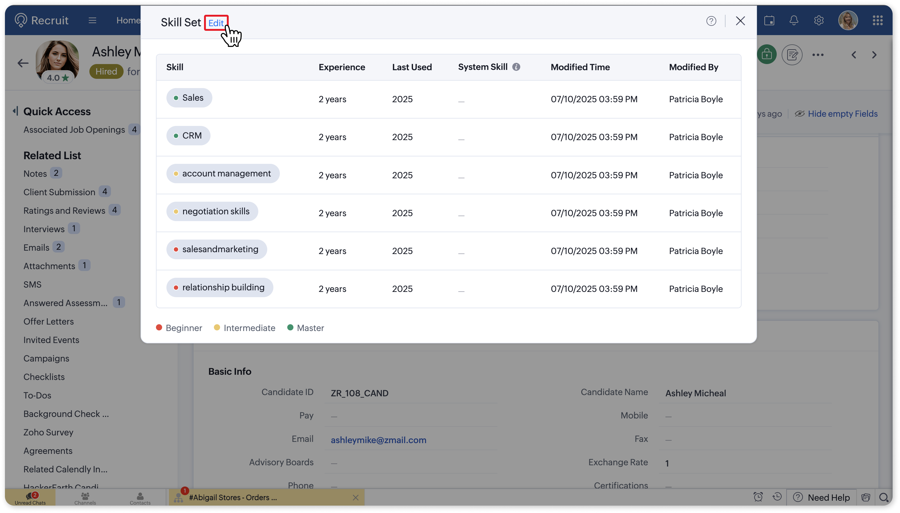 You will see all of the candidate's skills listed along with related data. Click Edit to make changes to the table.