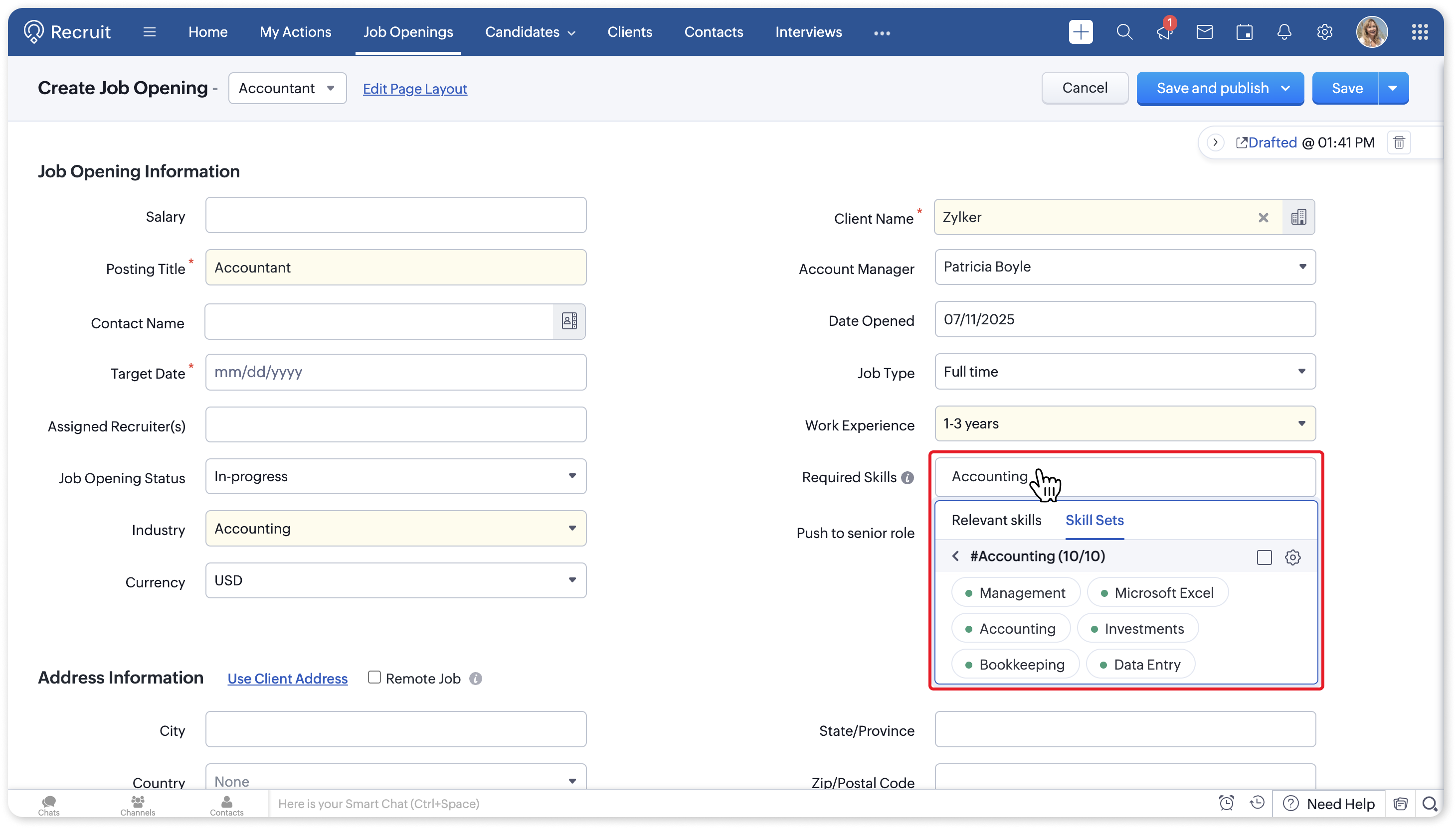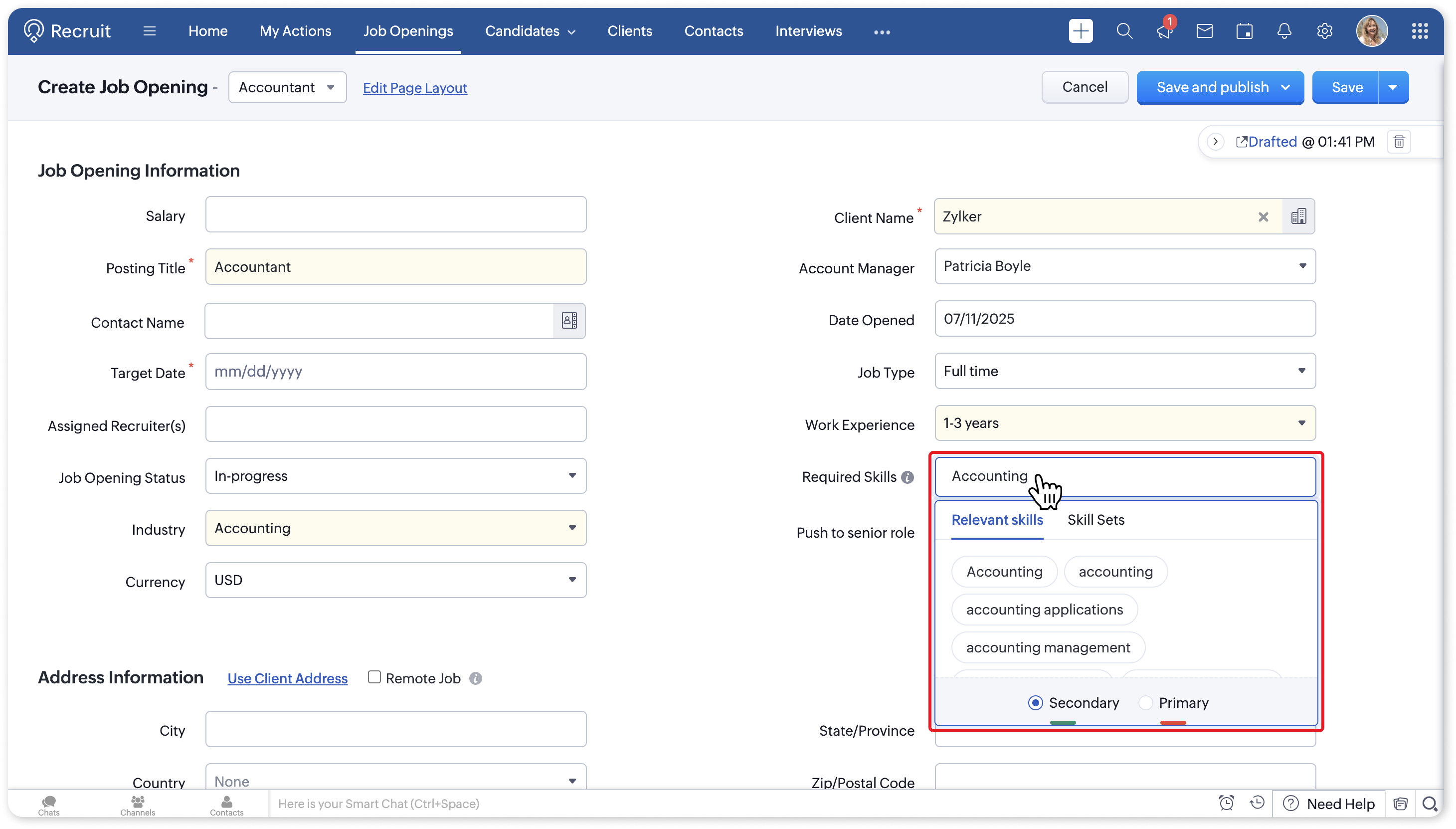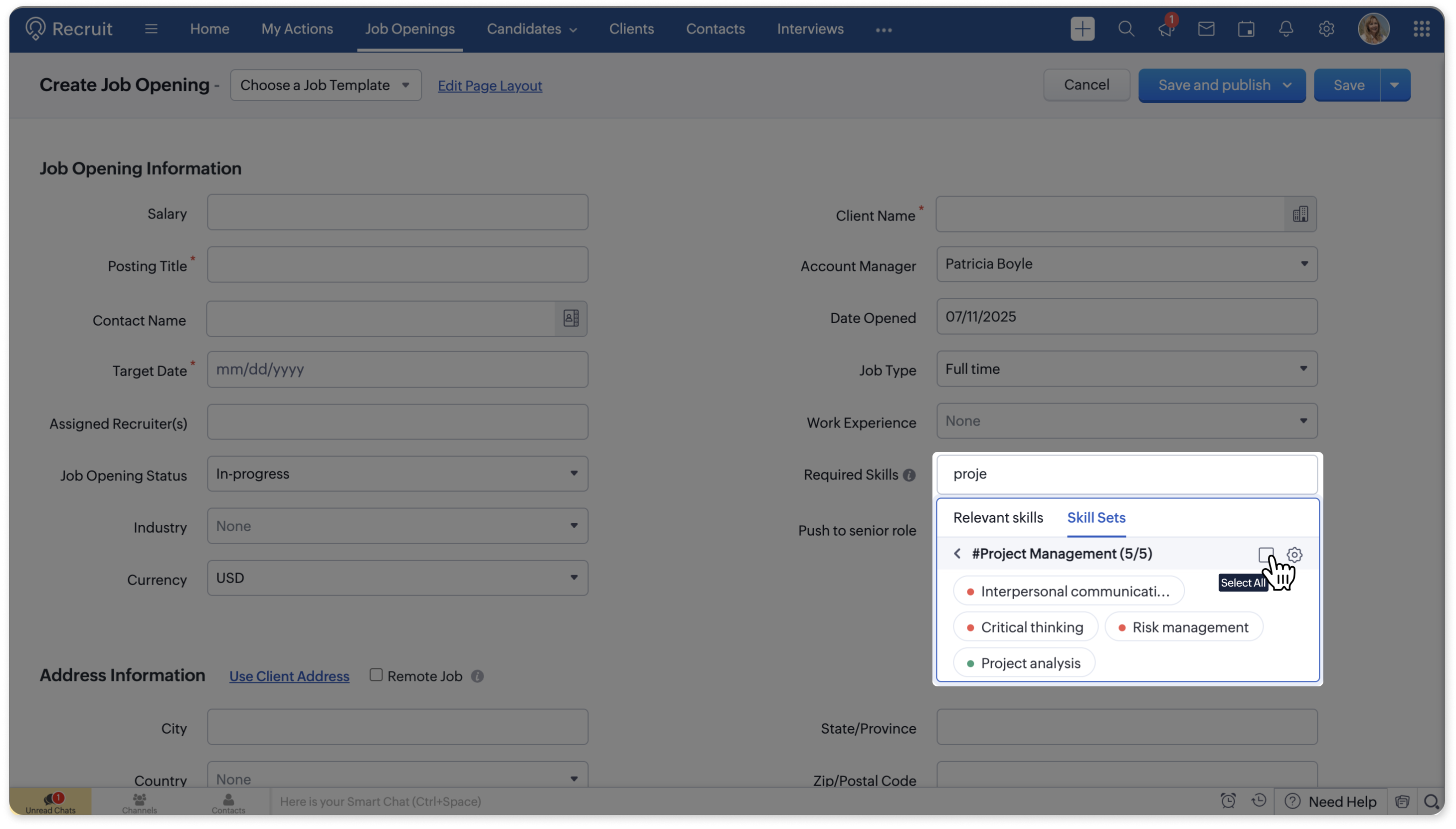 Once the skill set is created, you can use it to select all the skills in the Required Skills field of the job opening.
