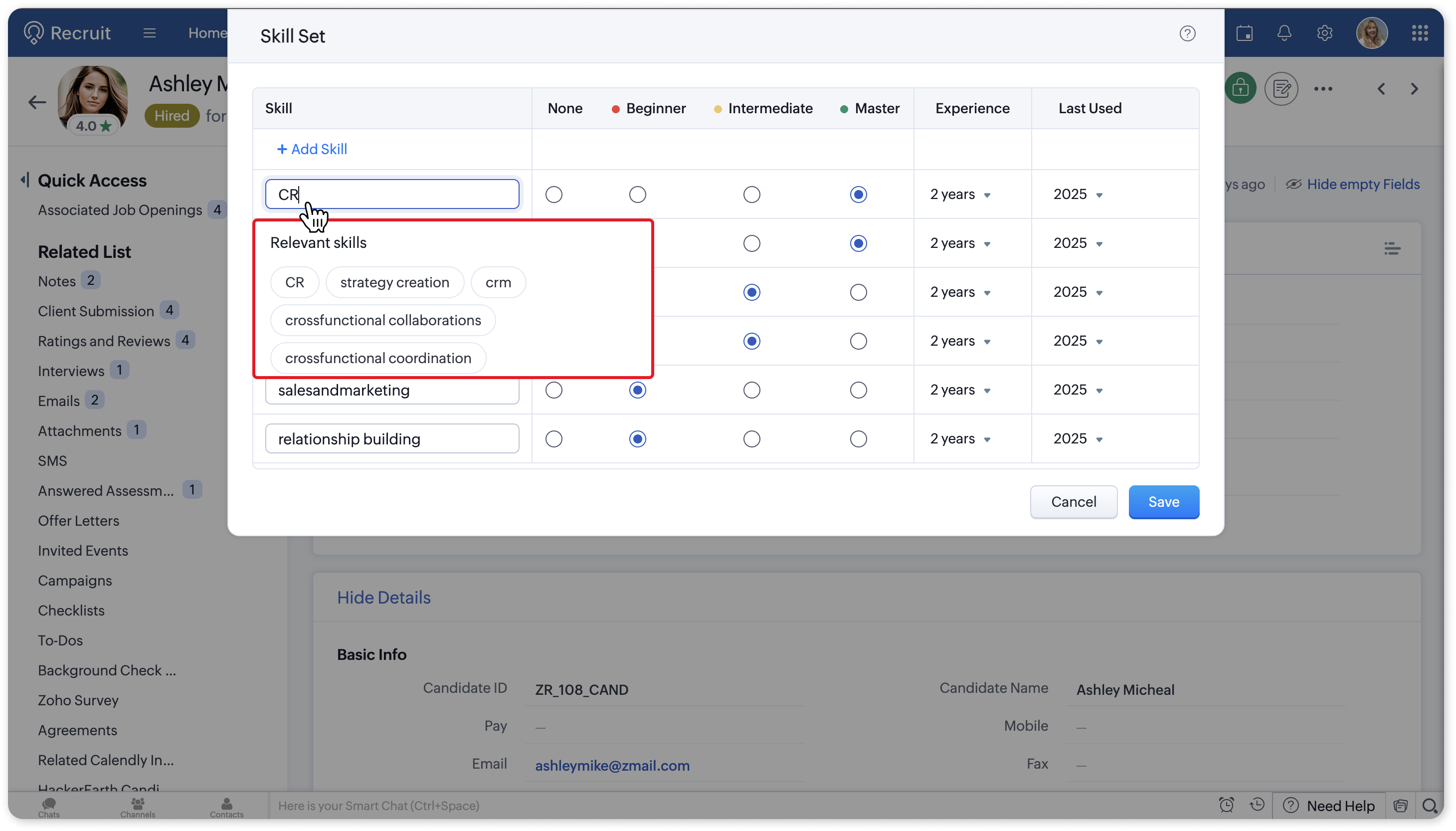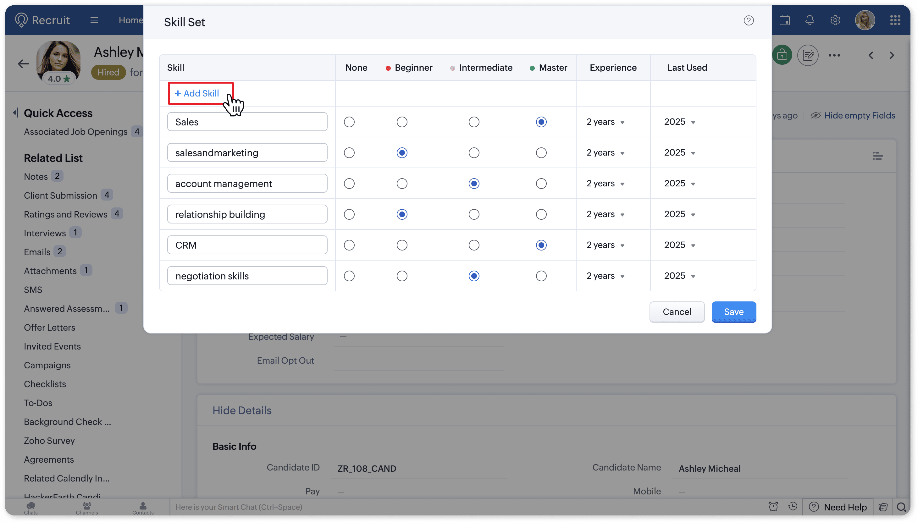 Click Save. The skill and all related details you selected will then be added to the candidate record.