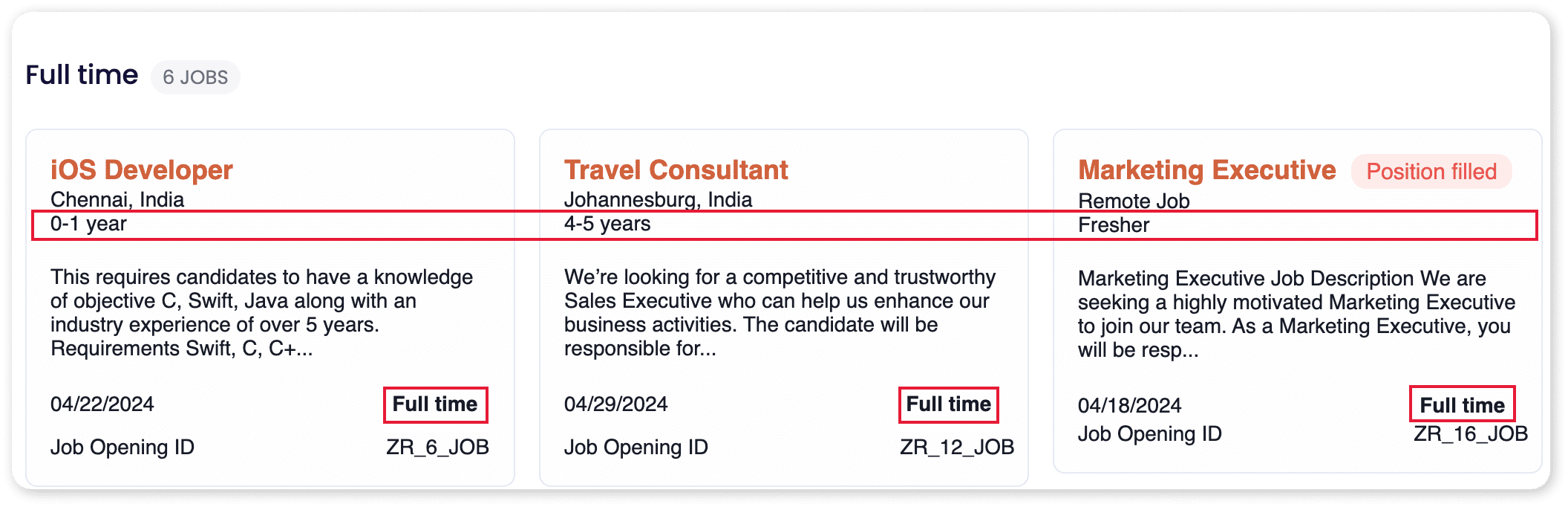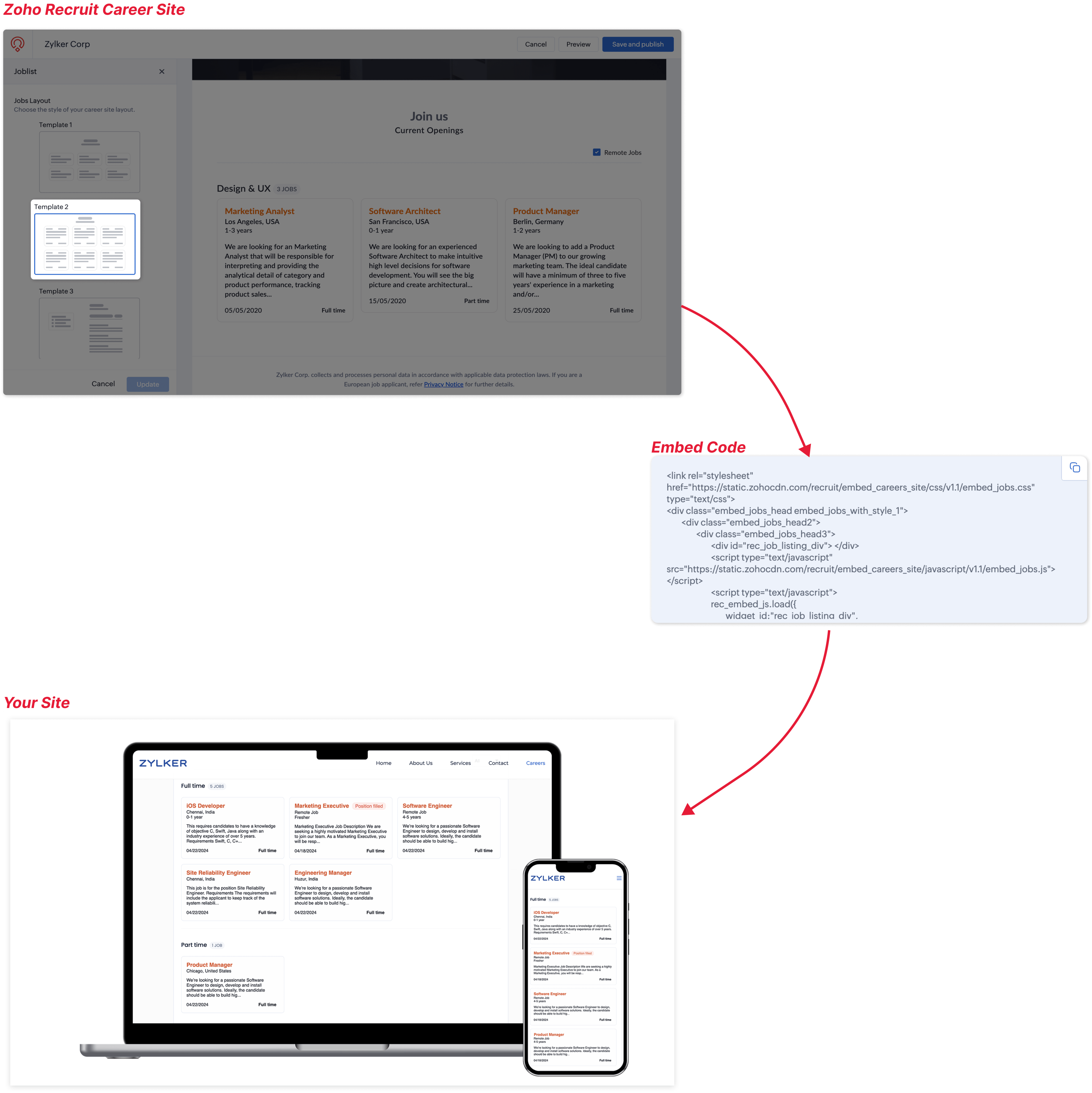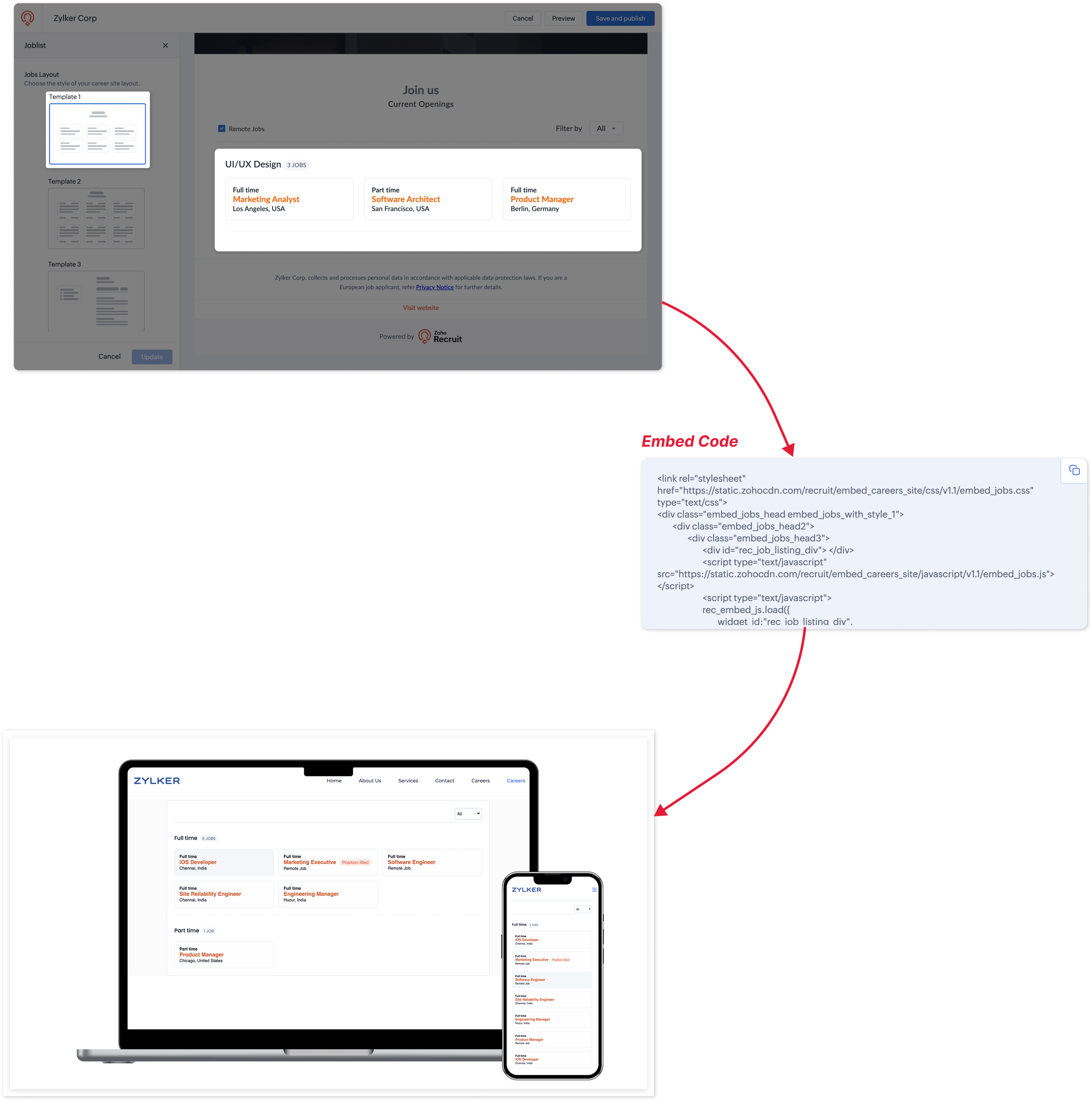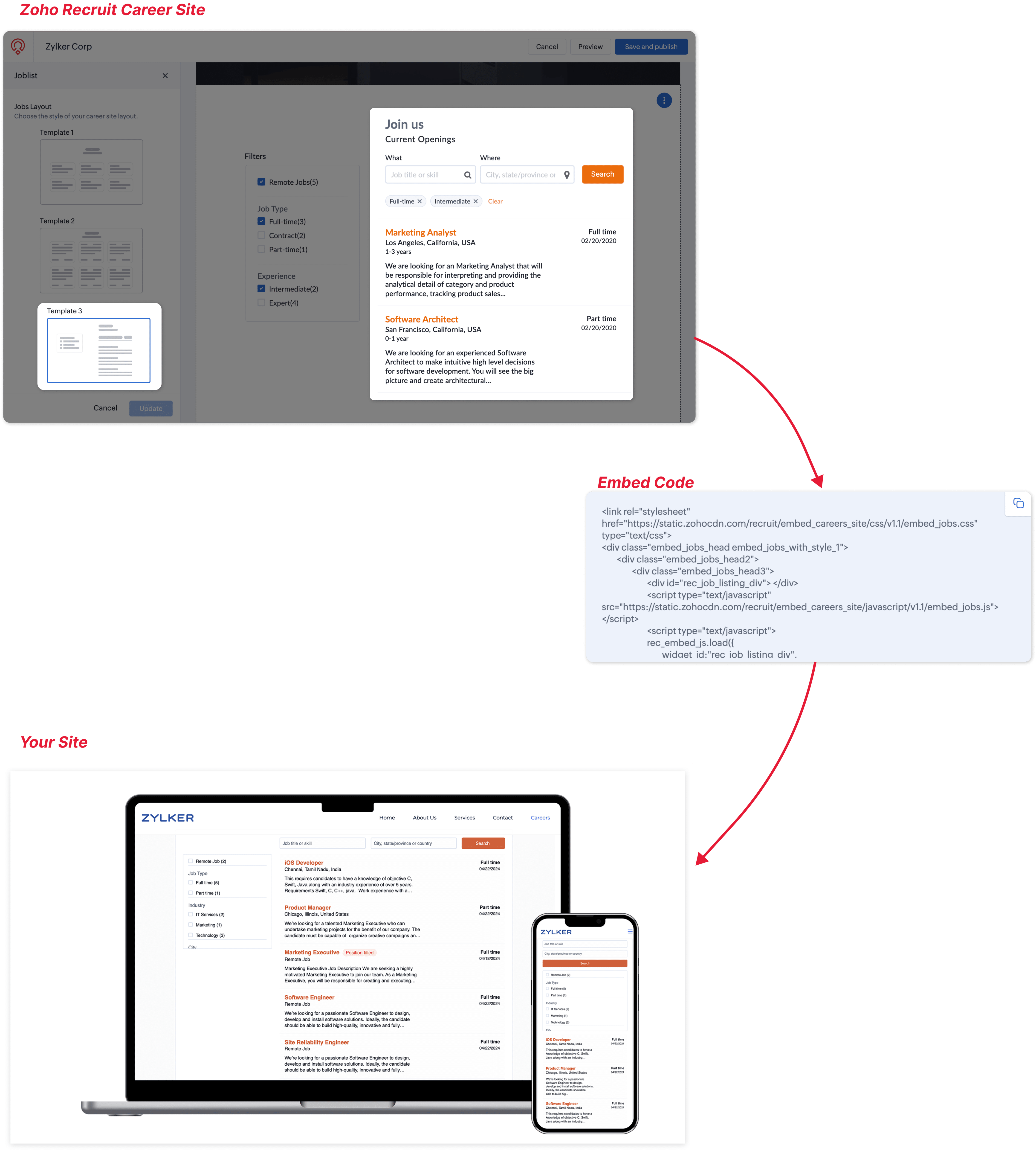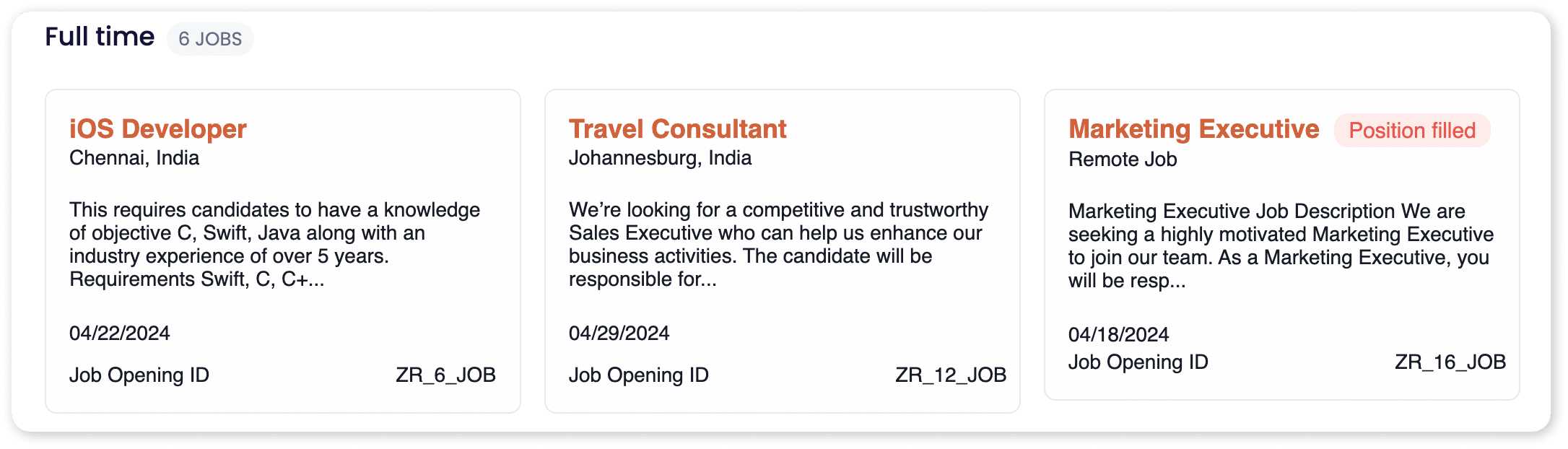 Zoho Recruit's Career Site provides three templates for job listings by default. You can choose the template that best suits your website's design and branding when embedding job listings from your Zoho Recruit Career Site.