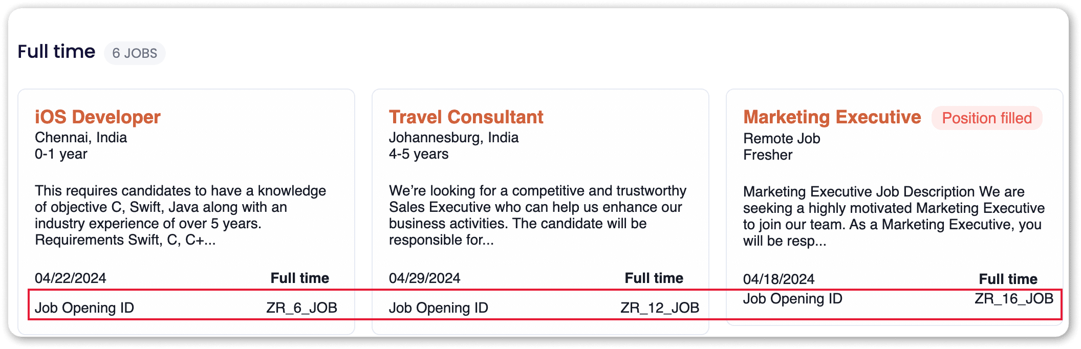 Now, incorporate the below code snippet into your website. The example below demonstrates how to include the Job_Opening_ID field: